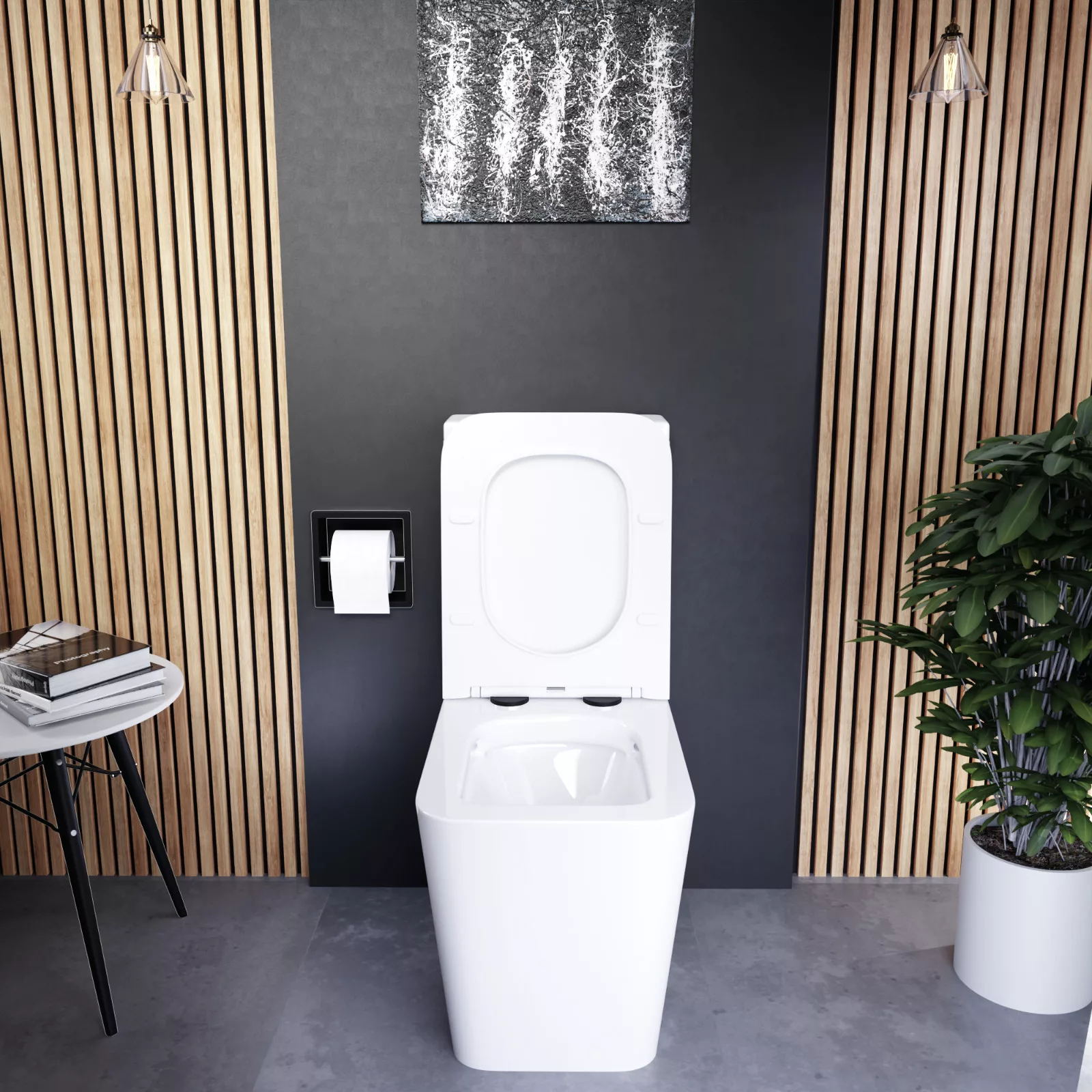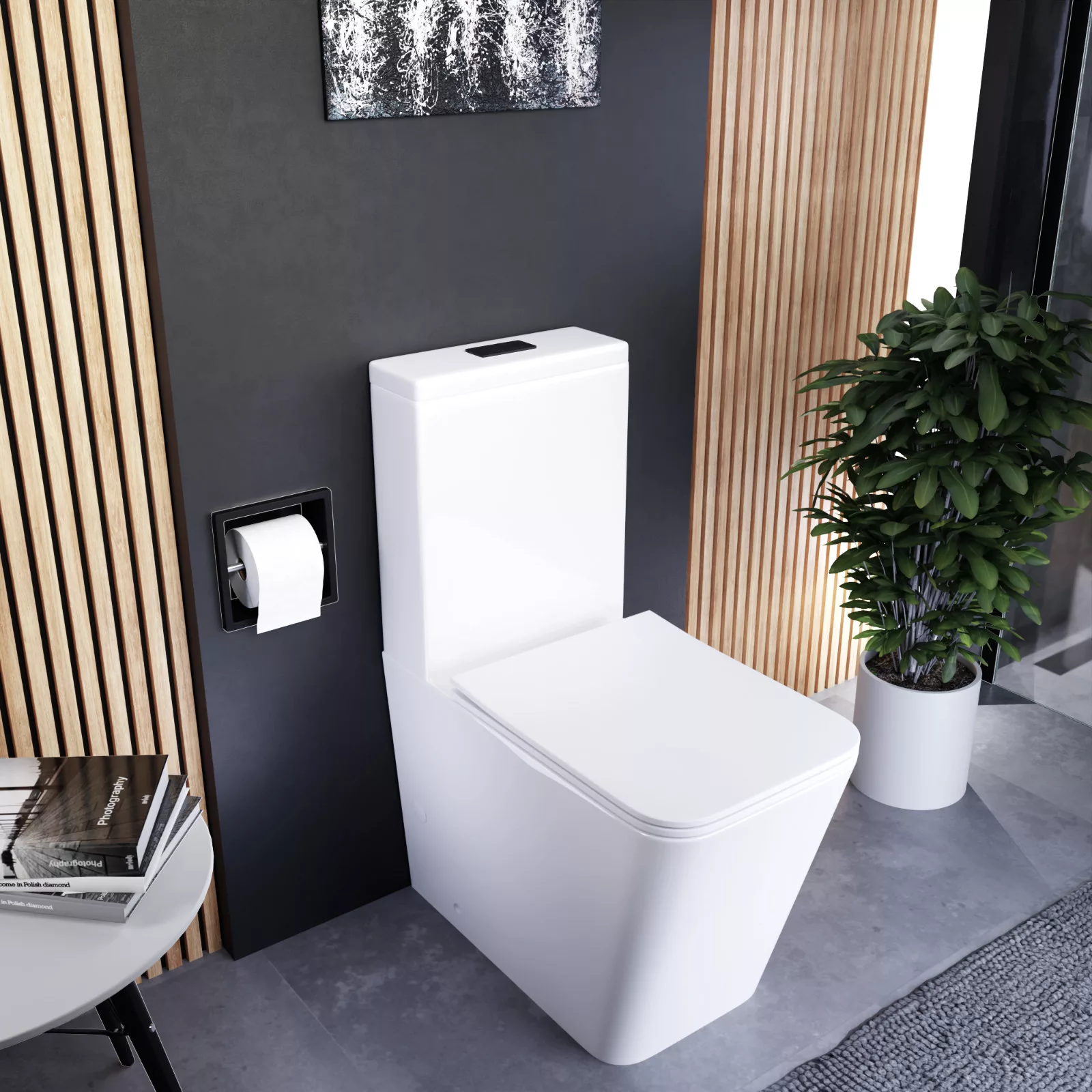 HD Ariana White perem nélküli mély öblítésű szögletes monoblokkos WC hátsó kifolyású slim "S" tetővel és matt fekete kiegészítőkkel + tartály