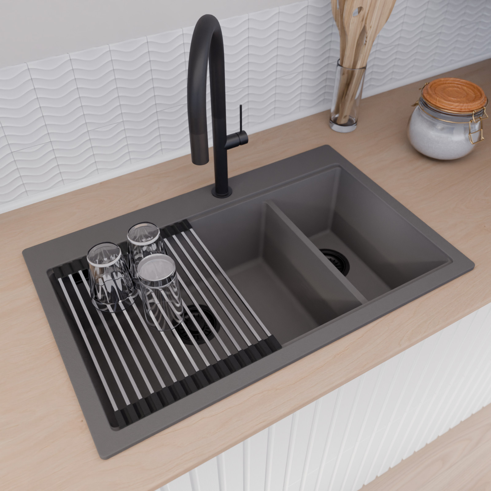 A mosogató prémium minőségű gránit kompozitból készült. Letisztult megjelenése mellett rendkívül praktikus, így bármilyen stílusú konyhába harmonikusan illeszkedik. A strapabíró gránit anyag hosszú távon is megbízható használatot garantál.