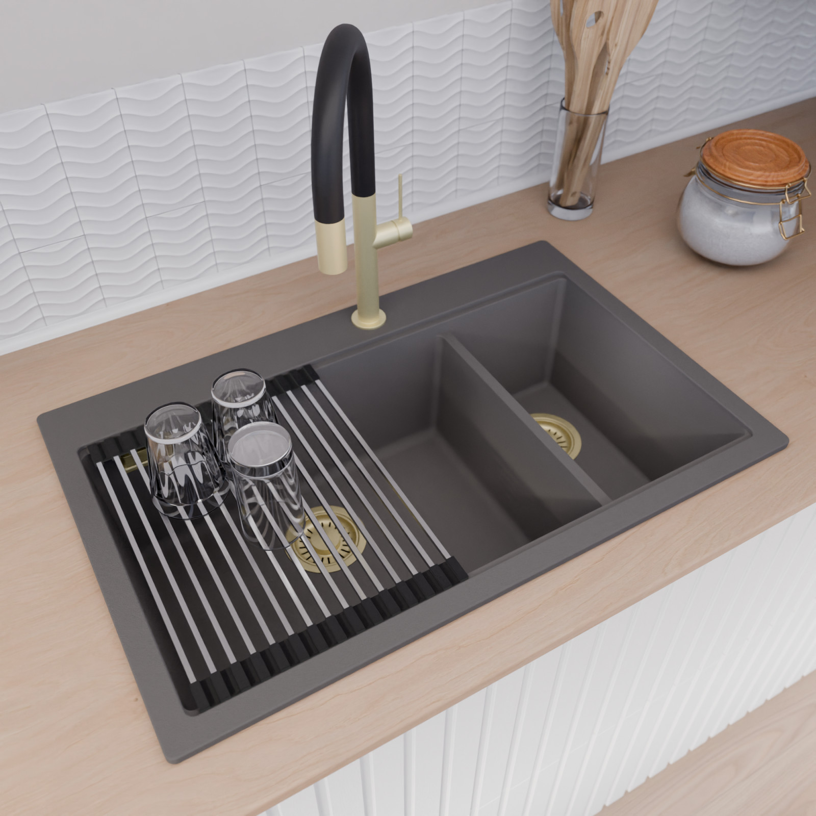 A mosogató prémium minőségű gránit kompozitból készült. Letisztult megjelenése mellett rendkívül praktikus, így bármilyen stílusú konyhába harmonikusan illeszkedik. A strapabíró gránit anyag hosszú távon is megbízható használatot garantál.