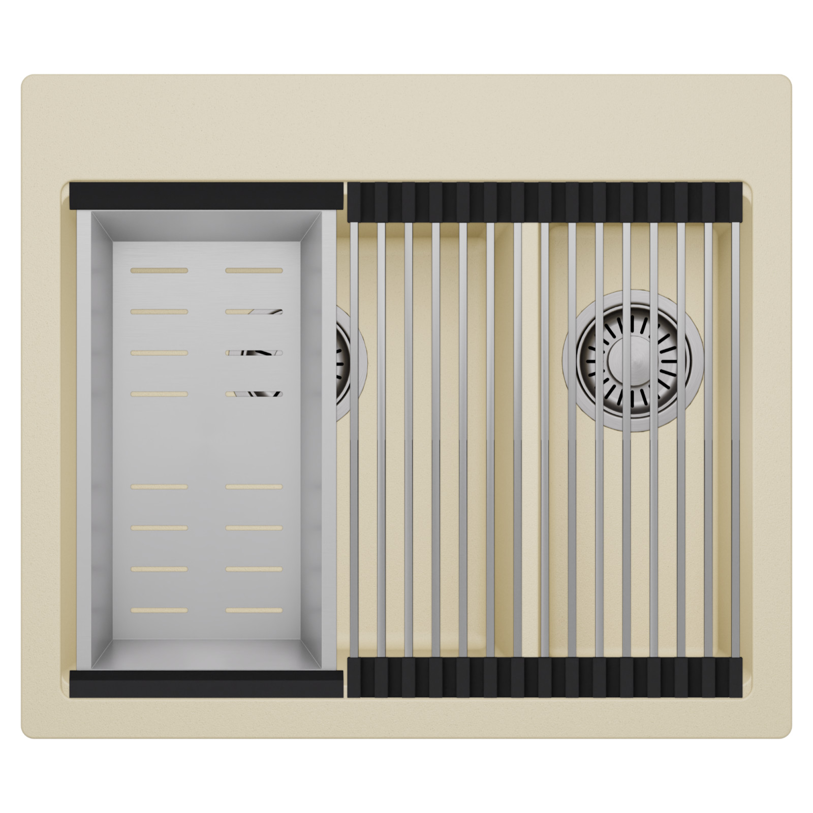 HD Aspen Beige 58 Kétmedencés mosogatótálca szett, csepegtetőráccsal és kosárral, soft bézs