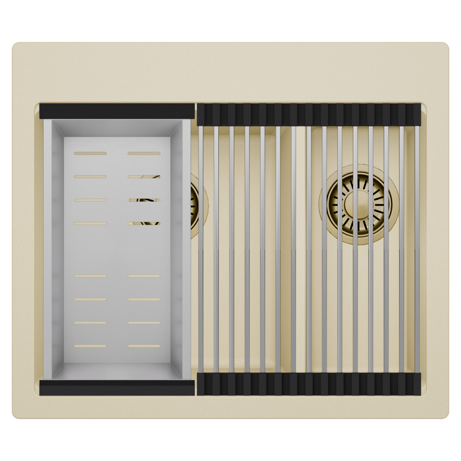 HD Aspen Beige 58 Kétmedencés mosogatótálca szett, csepegtetőráccsal és kosárral, soft bézs