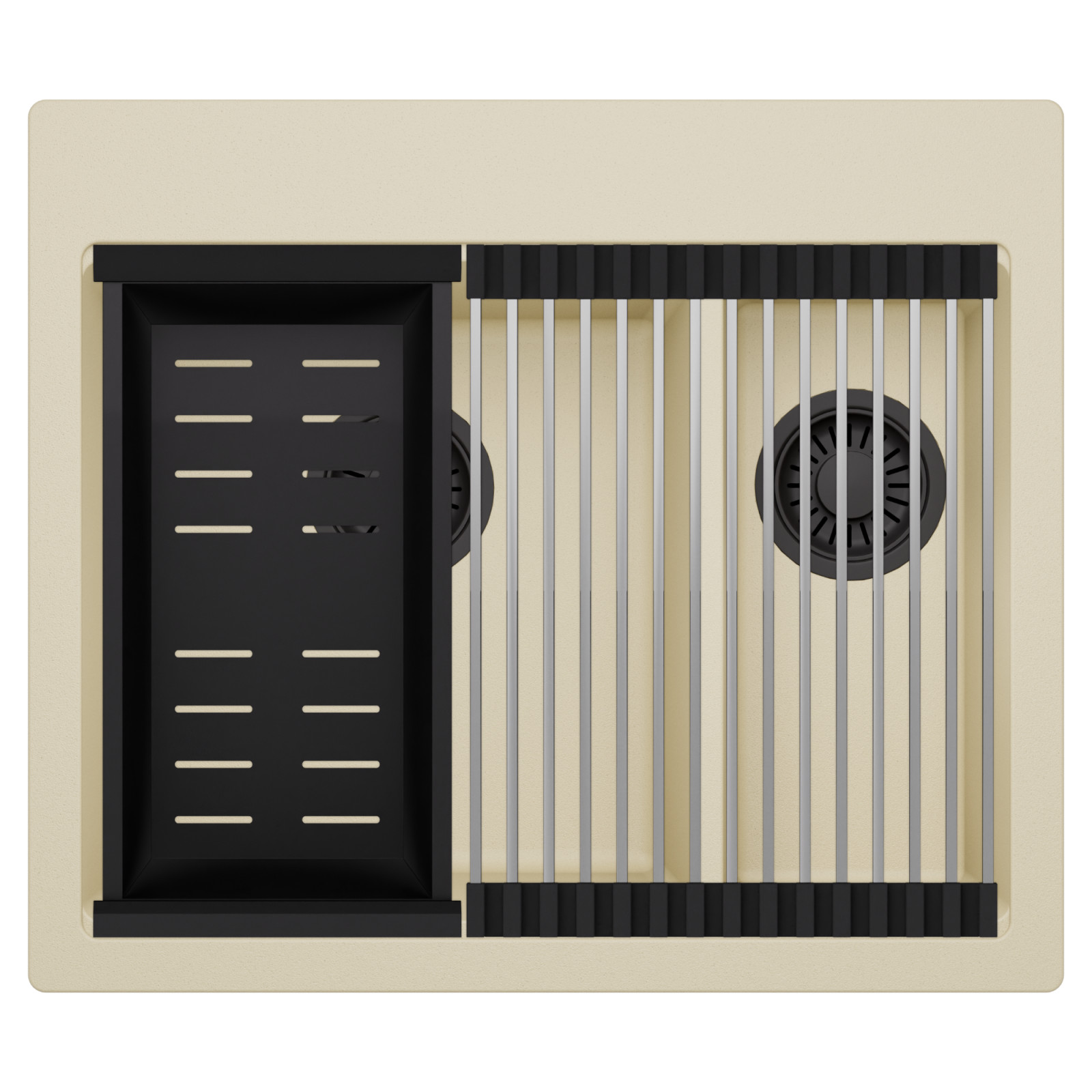 HD Aspen Beige 58 Kétmedencés mosogatótálca szett, csepegtetőráccsal és kosárral, soft bézs