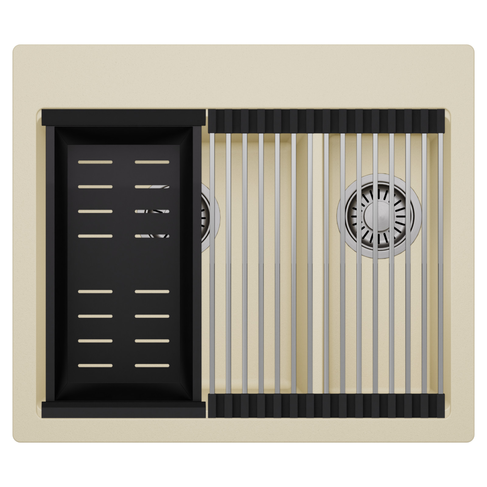 HD Aspen Beige 58 Kétmedencés mosogatótálca szett, csepegtetőráccsal és kosárral, soft bézs