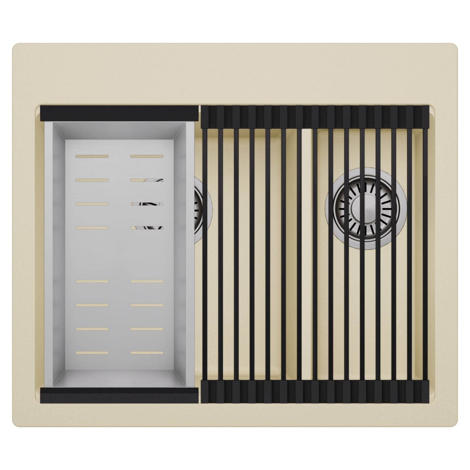 HD Aspen Beige 58 Kétmedencés mosogatótálca szett, csepegtetőráccsal és kosárral, soft bézs