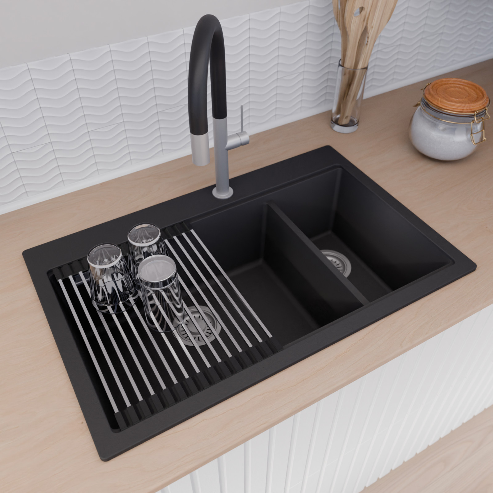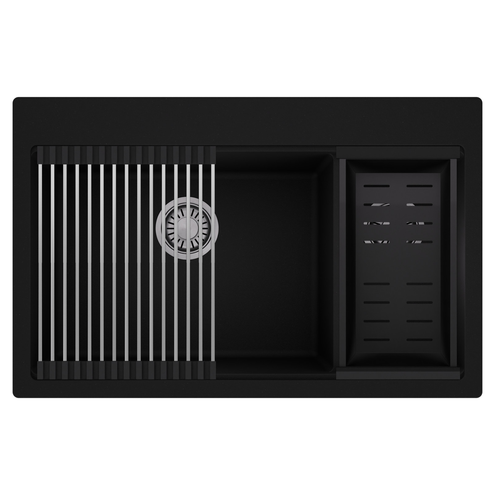 HD Aspen 78 Kétmedencés mosogatótálca szett, csepegtetőráccsal és kosárral, matt fekete