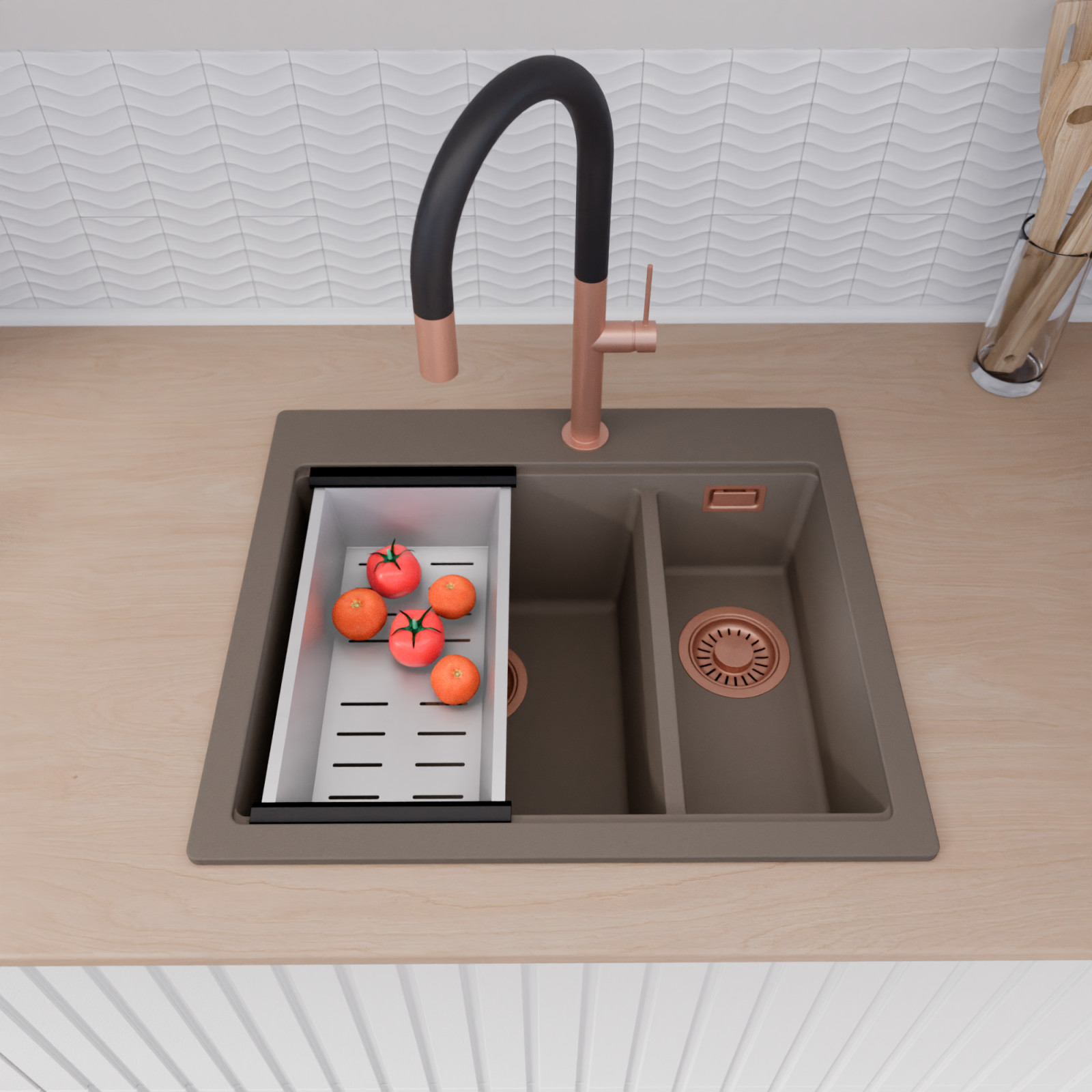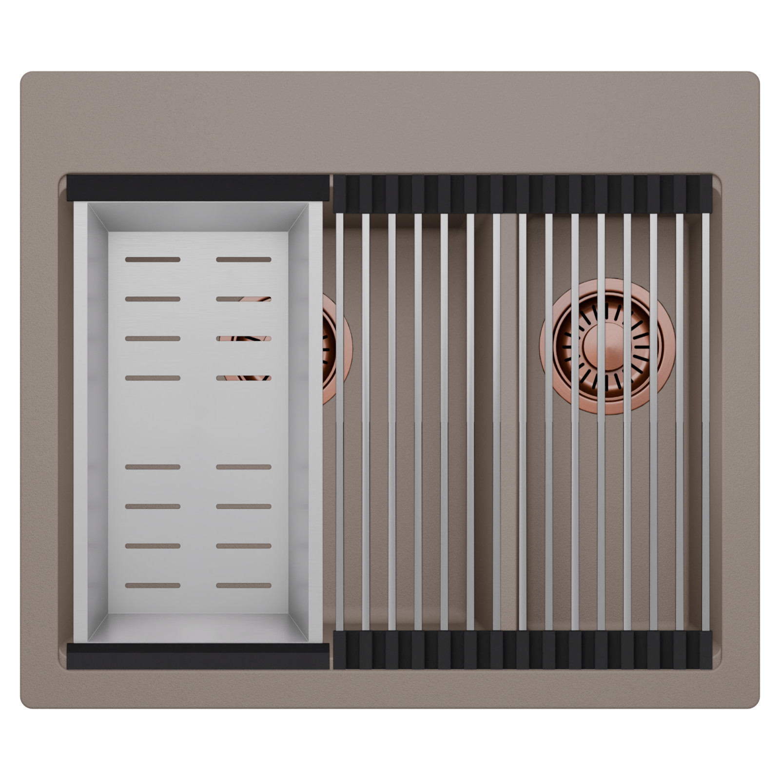 HD Aspen Tortora 58 Kétmedencés mosogatótálca szett, csepegtetőráccsal és kosárral, tortora