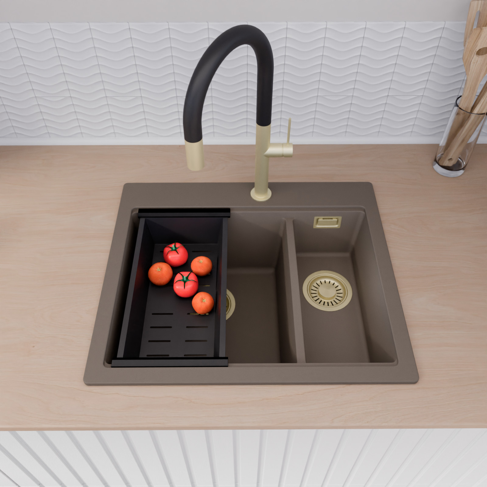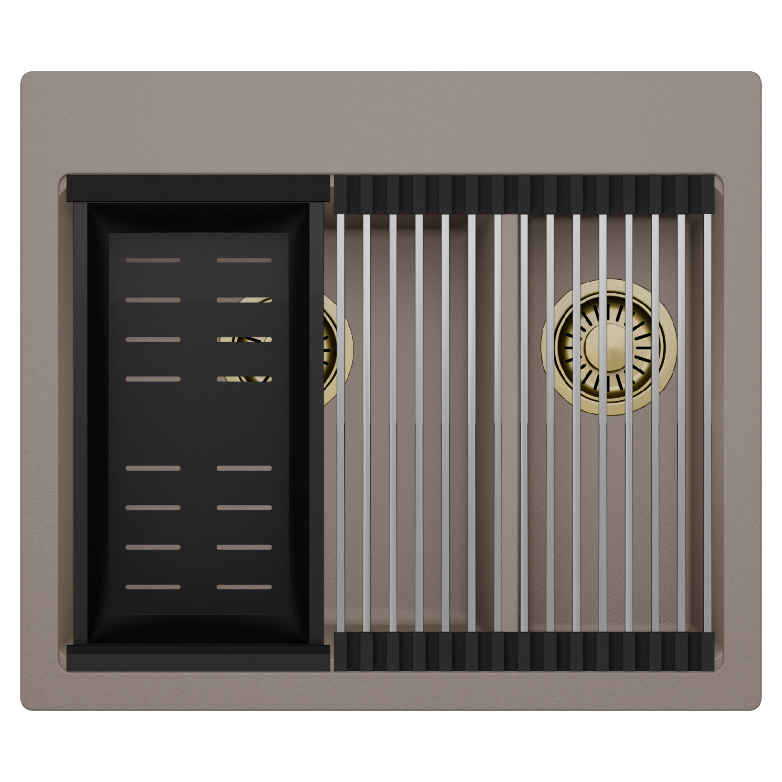 HD Aspen Tortora 58 Kétmedencés mosogatótálca szett, csepegtetőráccsal és kosárral, tortora