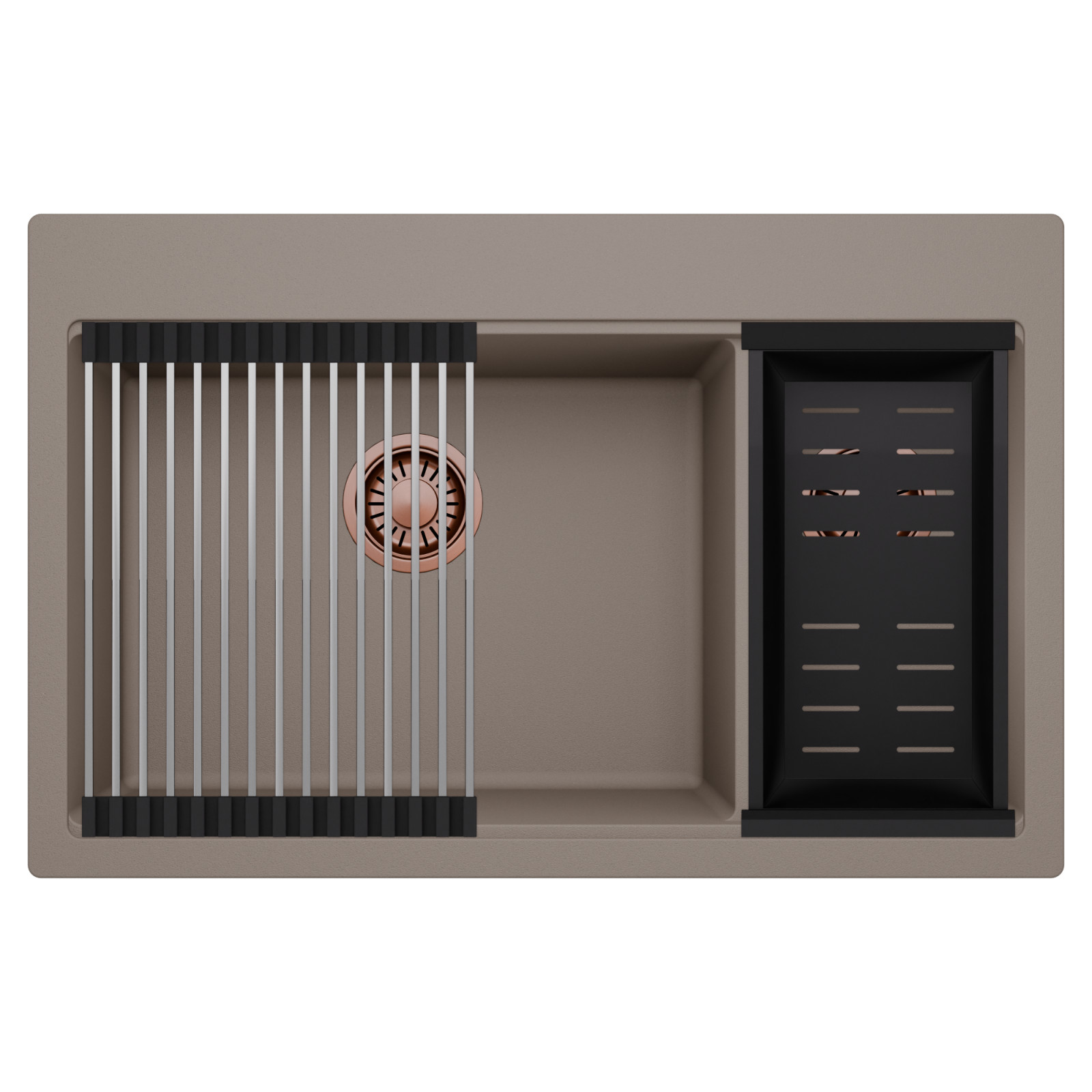 HD Aspen Tortora 78 Kétmedencés mosogatótálca szett, csepegtetőráccsal és kosárral, tortora