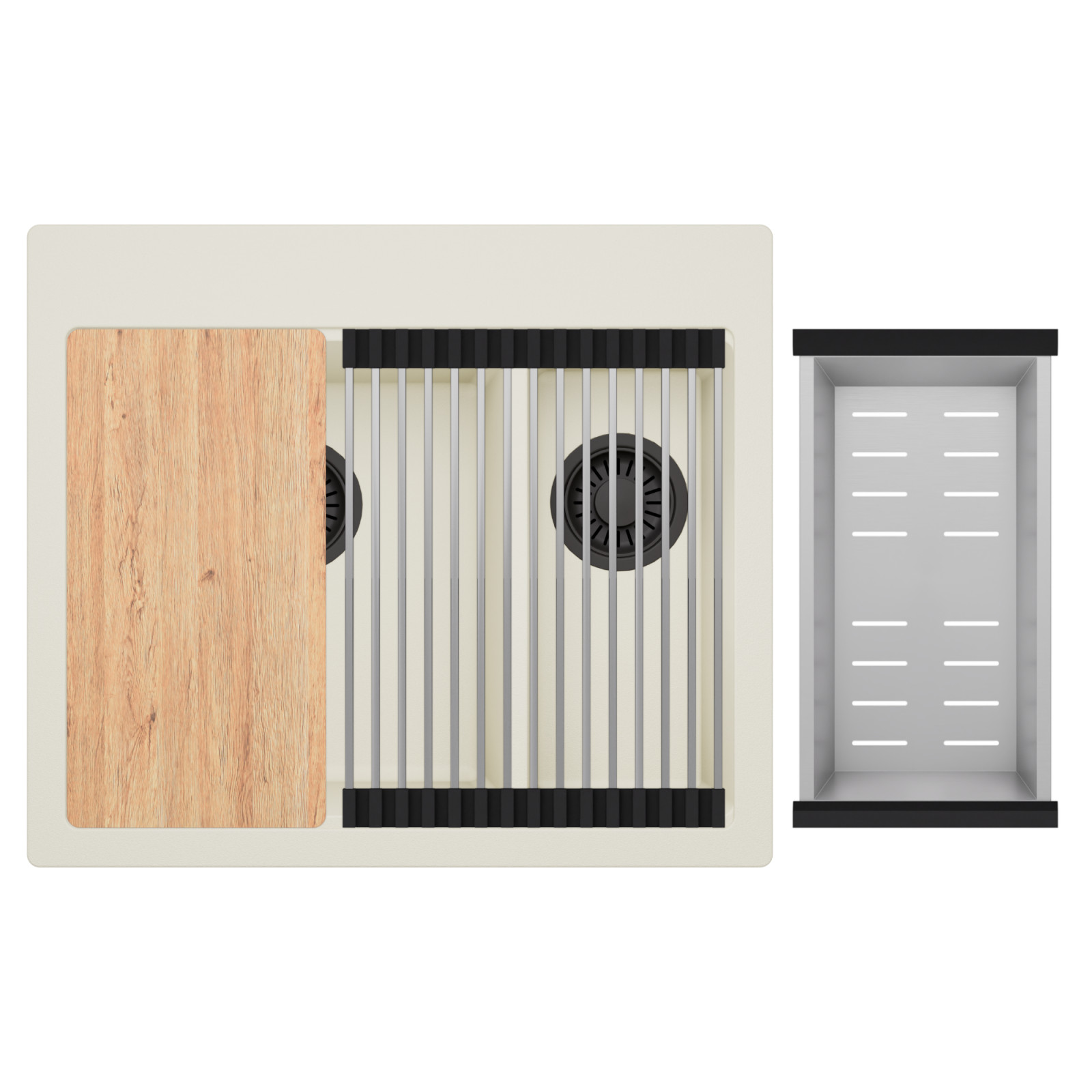 HD Aspen White 58 Kétmedencés mosogatótálca szett, vágódeszkával, csepegtetőráccsal és kosárral, tört fehér