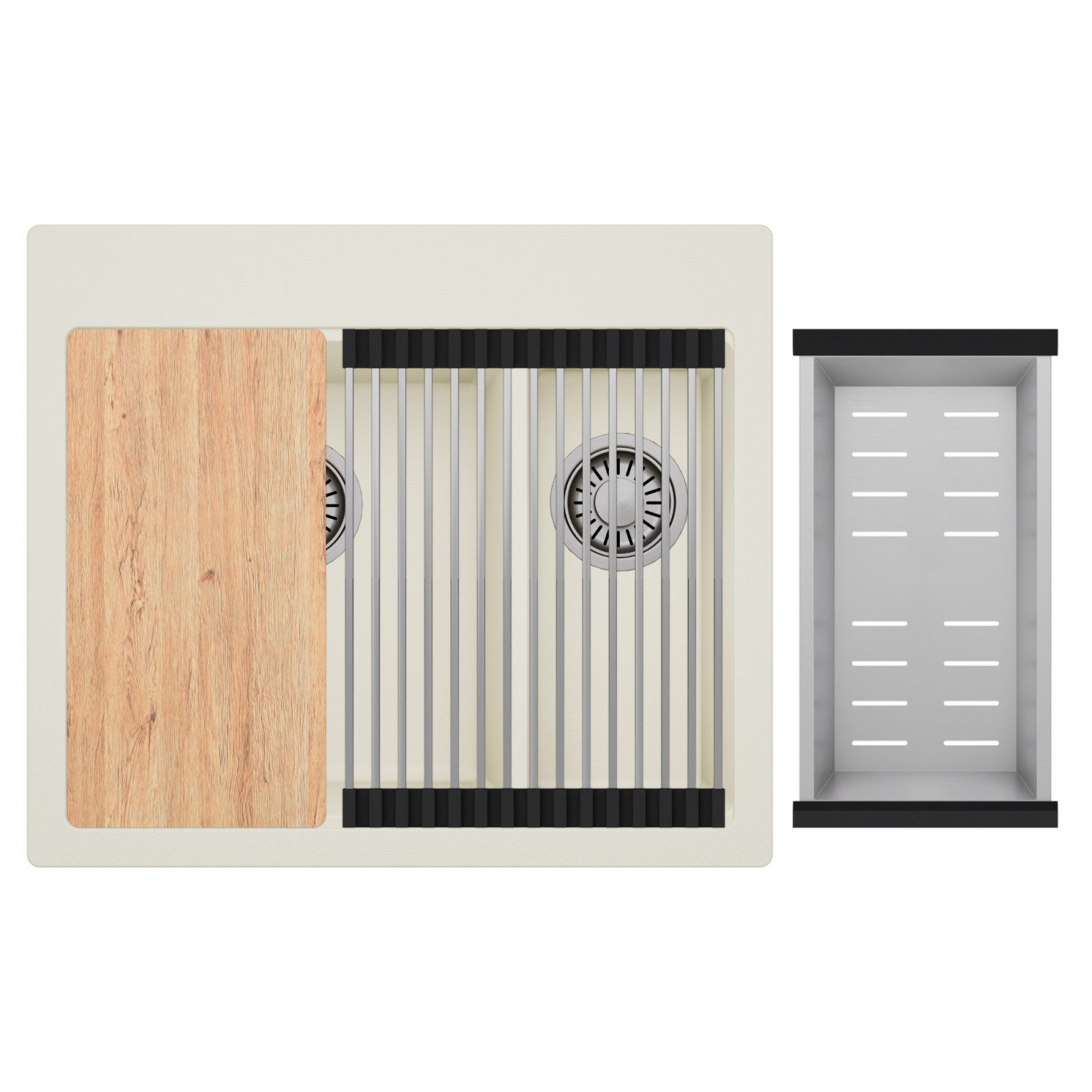 HD Aspen White 58 Kétmedencés mosogatótálca szett, vágódeszkával, csepegtetőráccsal és kosárral, tört fehér