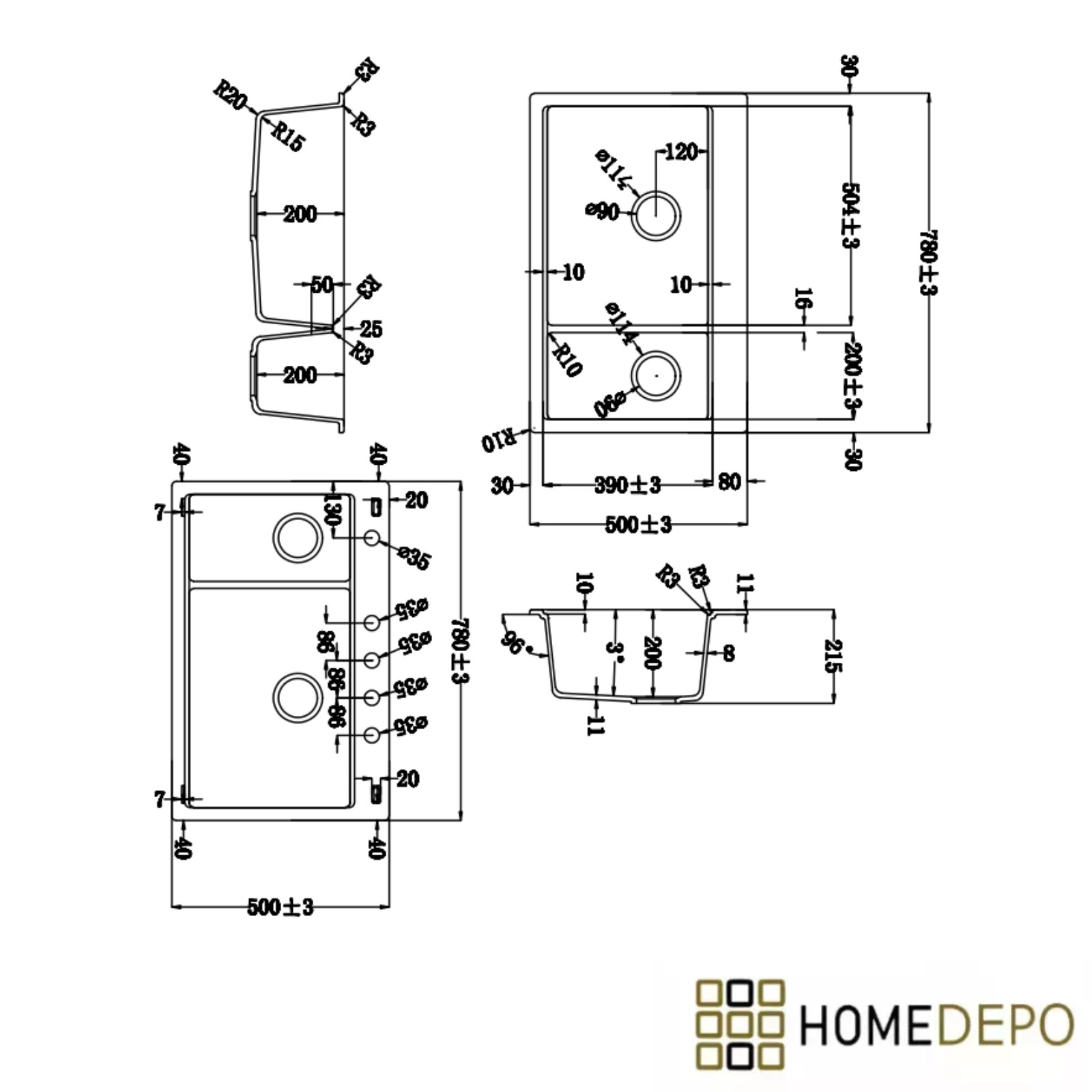 Termék mérete: 58x50 cm Szekrényméreti igény: 60 cm Medence mérete: Nagy medence: 50x39x20 cm; kis medence: 20x39x20 cm Medencék száma: Kétmedencés Felhasználhatóság: Pultba építhető Könnyített fúratok száma: 3 Anyag: Gránit Anyagvastagság: 8-10 mm Tartozékok: Mosogatótálca, rozsdamentes acél csepegtetőrács, matt fekete csepegtetőkosár, szifon - túlfolyóval és lefolyó takaróval Szifon szín: Matt fekete Lefolyó takaró anyaga: Rozsdamentes acél HomeDepo SmartEdge Többfunkciós Peremrendszer