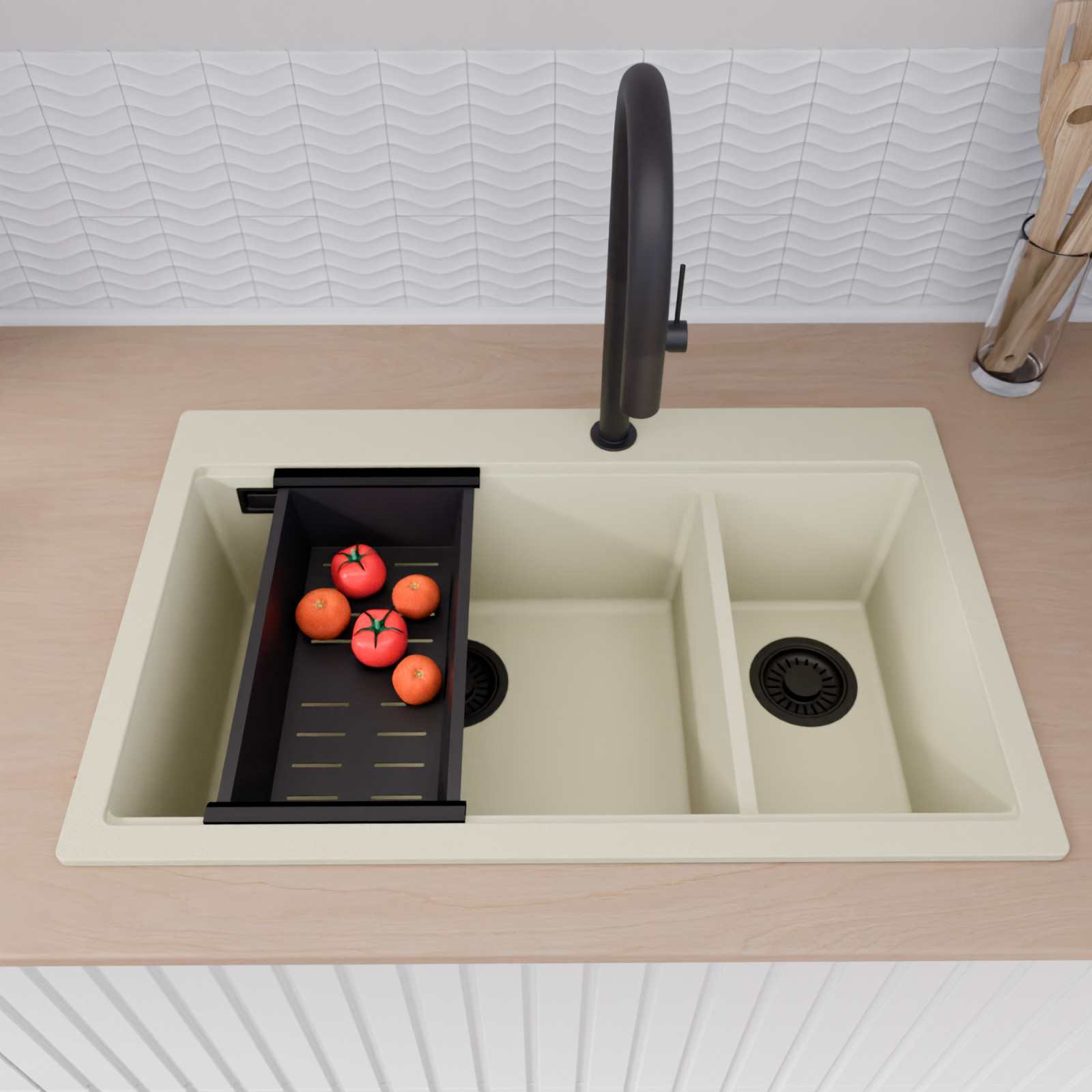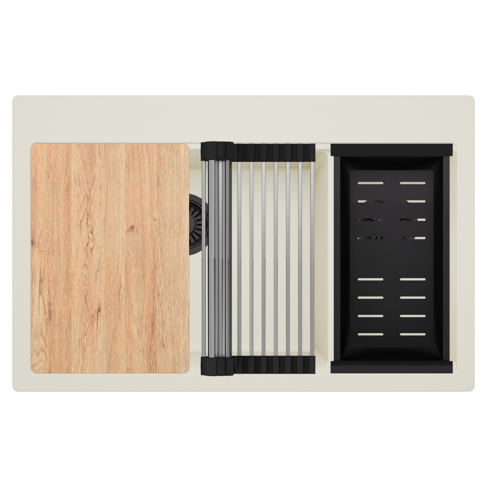 HD Aspen White 78 Kétmedencés mosogatótálca szett, vágódeszkával, csepegtetőráccsal és kosárral, tört fehér