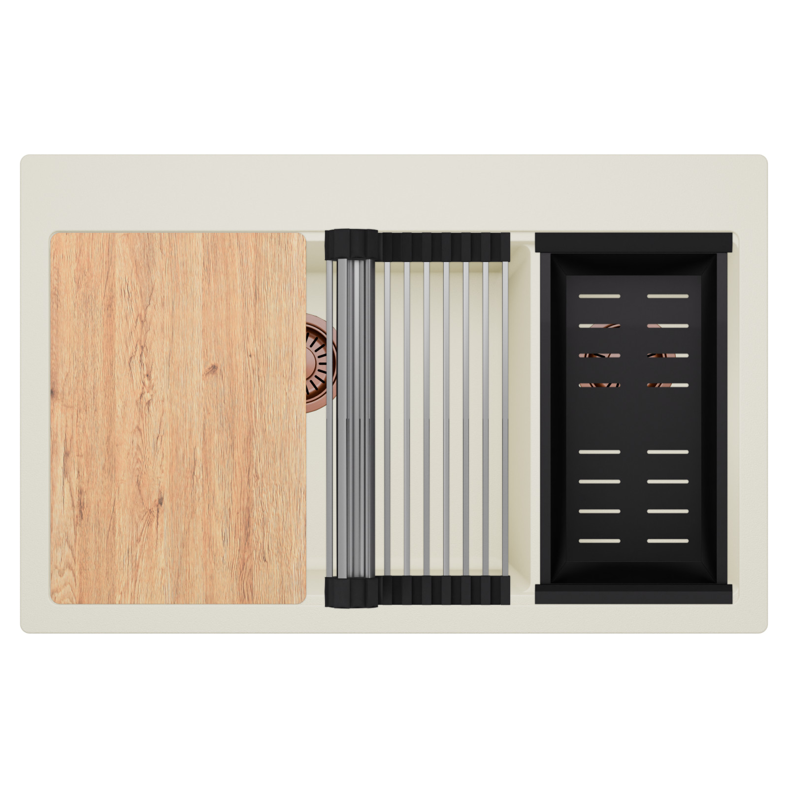 HD Aspen White 78 kétmedencés gránit mosogatótálca szett, vágódeszkával, acél csepegtetőráccsal és matt fekete kosárral, tört fehér színben, szálcsiszolt réz leeresztő szifonnal