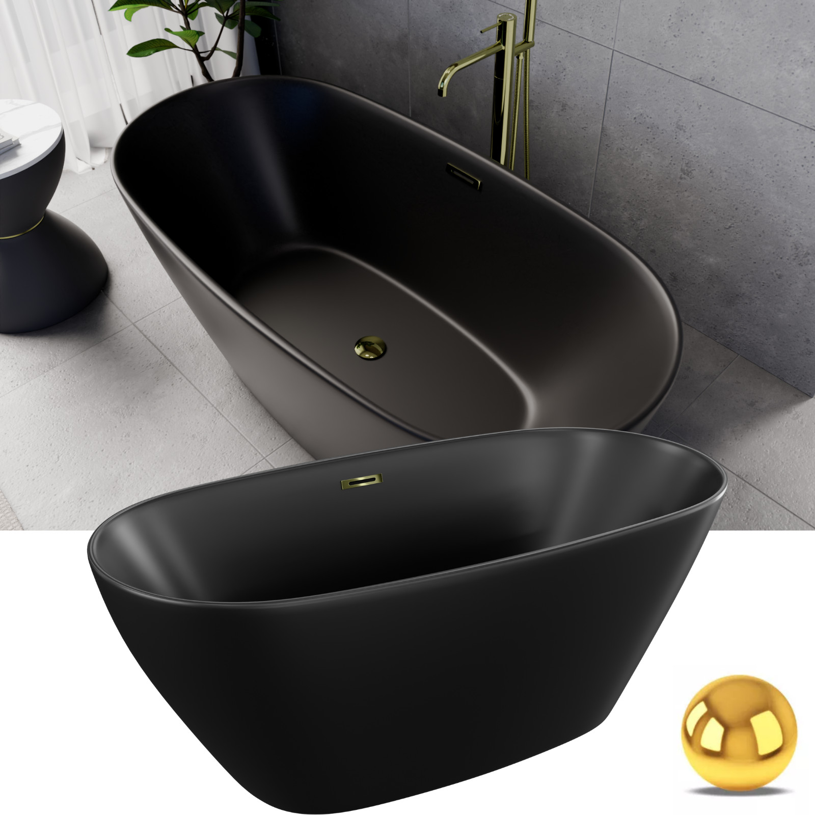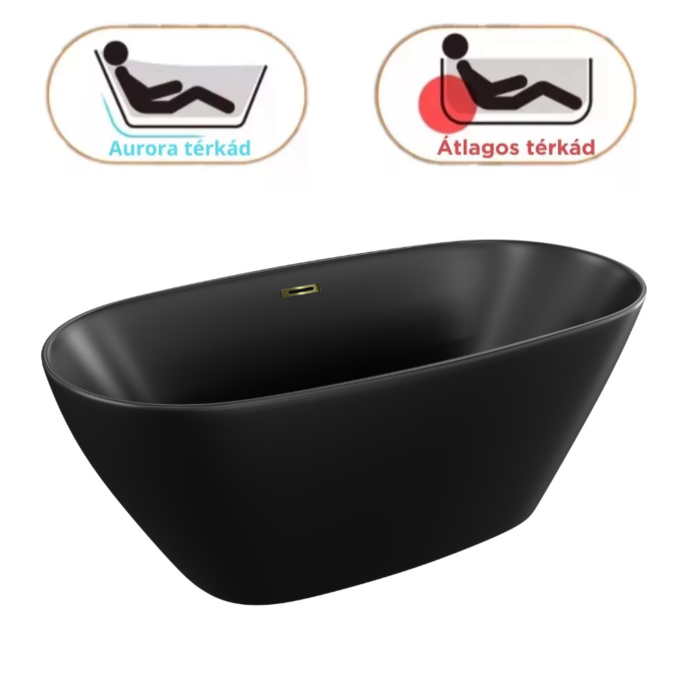 HD Aurora Matt Black 150/160/170 cm hosszú ovális térben álló akril kád fényes arany túlfolyóval és click-clack leeresztővel
