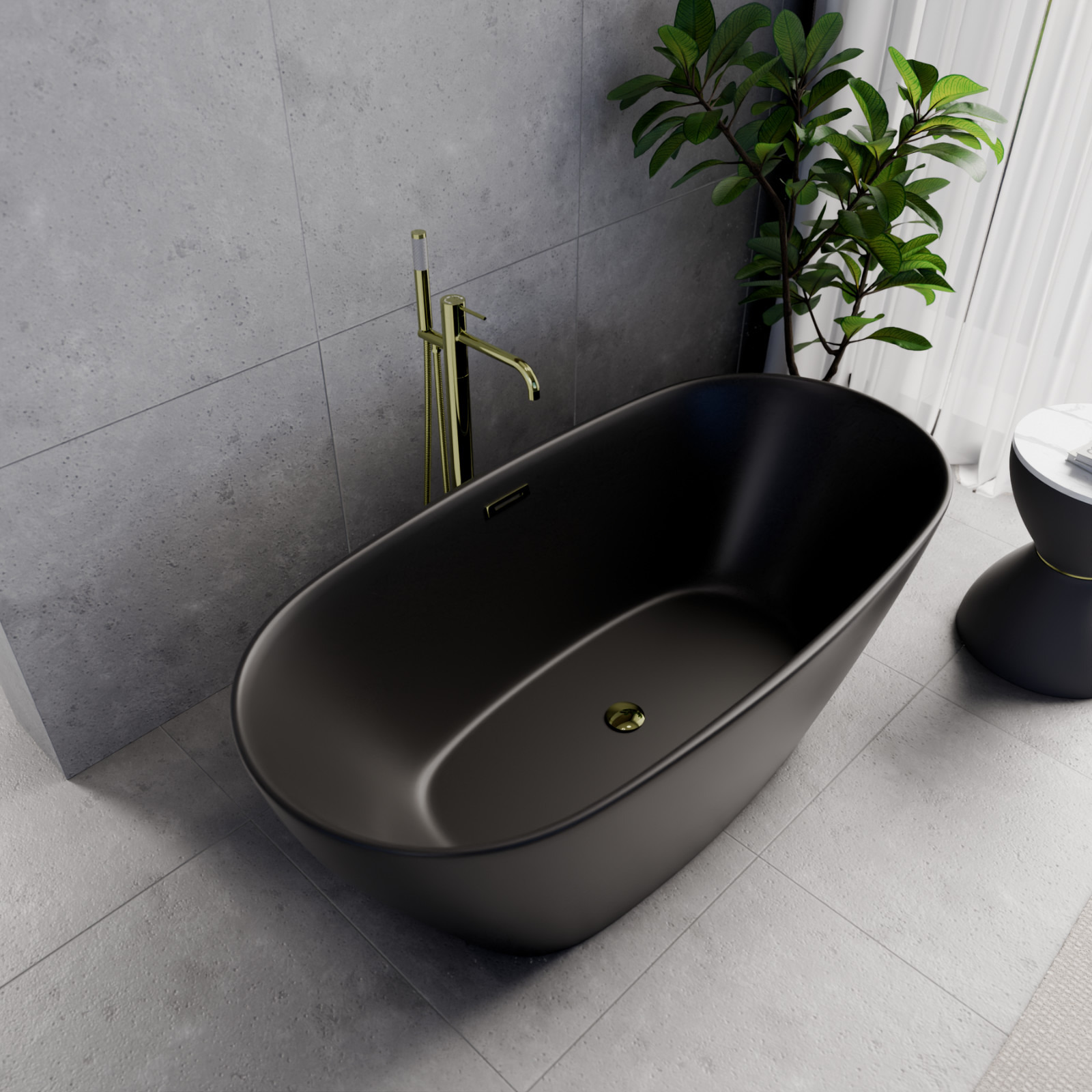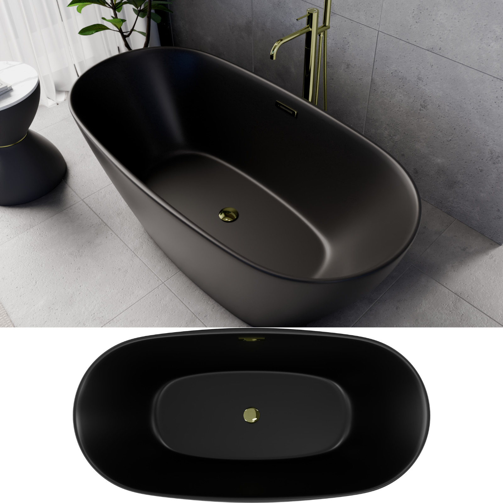 Ovális formájú térben álló matt fekete akril kád tükörsima felülettel, amely egy kiváló minőségű és egyedi stílusú fürdőszobai luxus termék fényes arany túlfolyóval és click-clack leeresztővel.