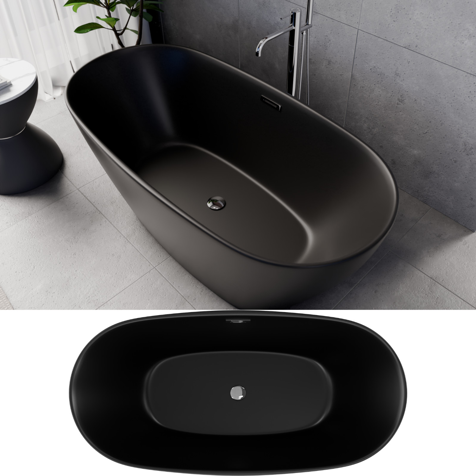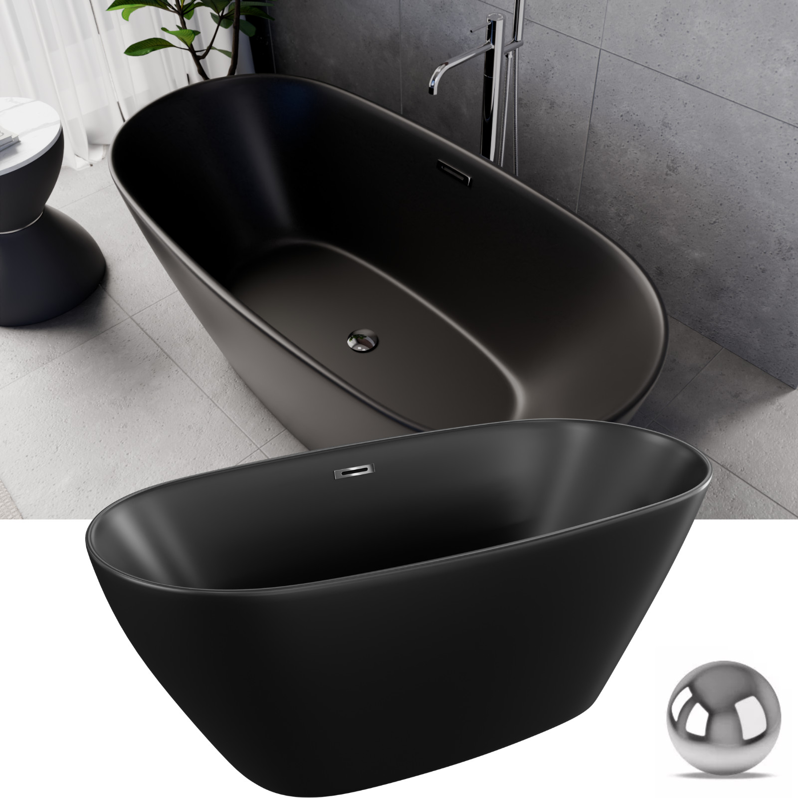 Ovális formájú térben álló matt fekete akril kád tükörsima felülettel, amely egy kiváló minőségű és egyedi stílusú fürdőszobai luxus termék fényes króm túlfolyóval és click-clack leeresztővel.