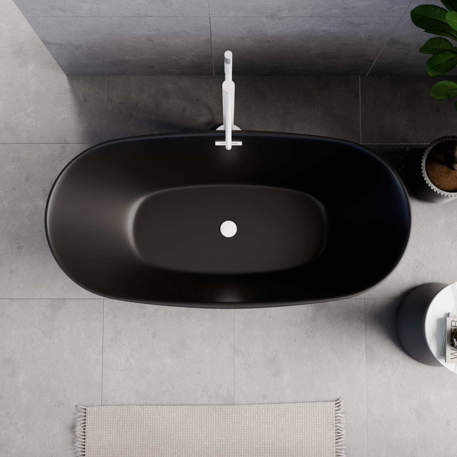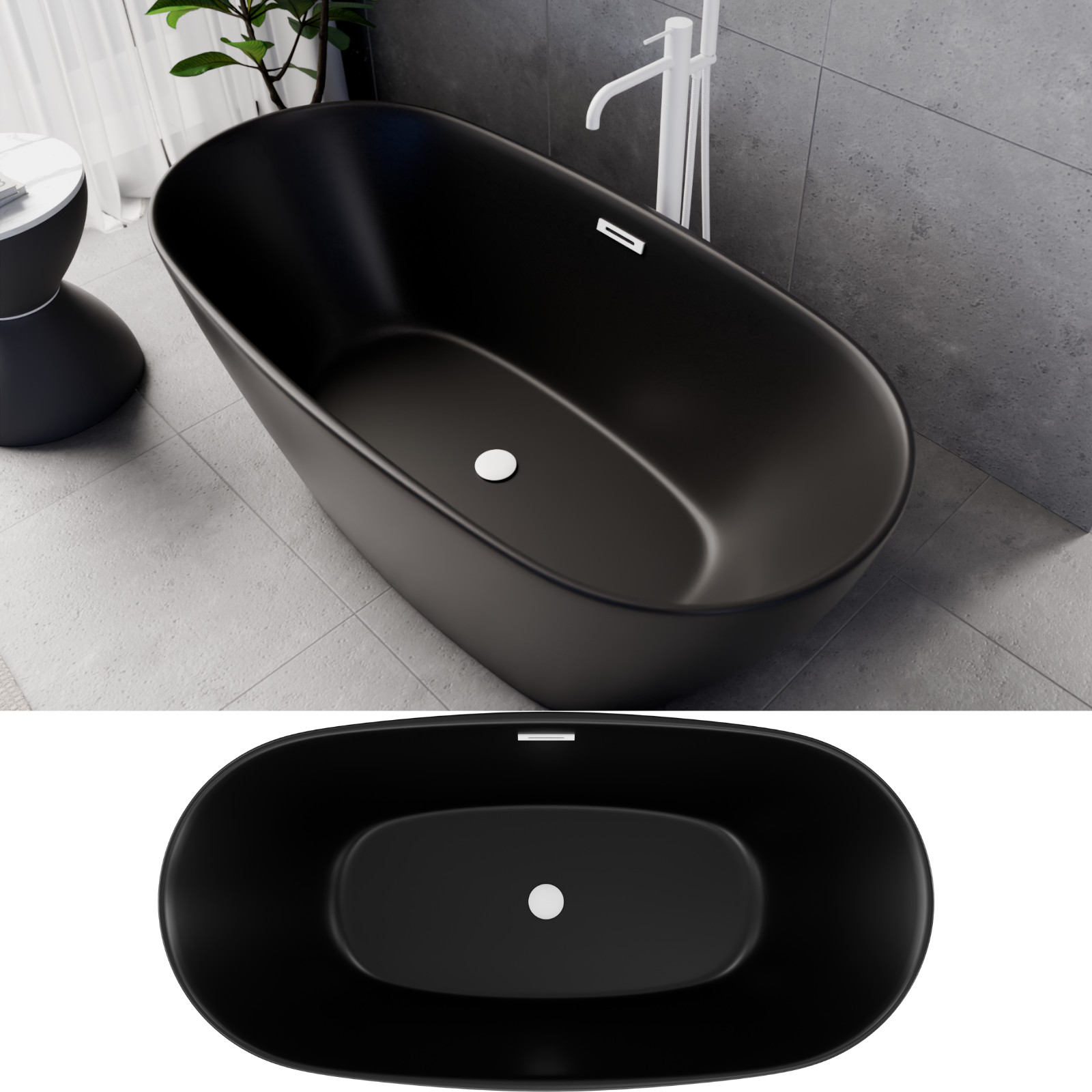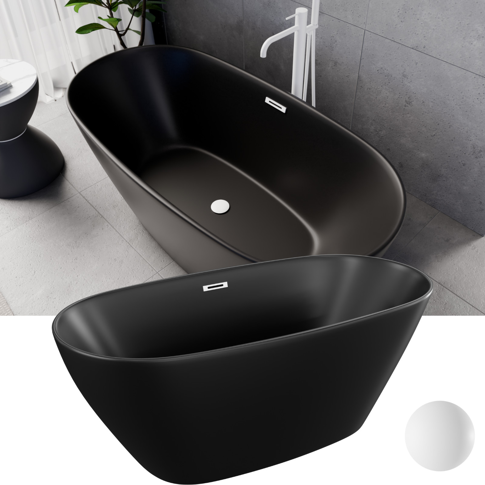 Aurora Matt Black ovális térben álló akril kád, 150 cm hosszú, matt fehér elemekkel