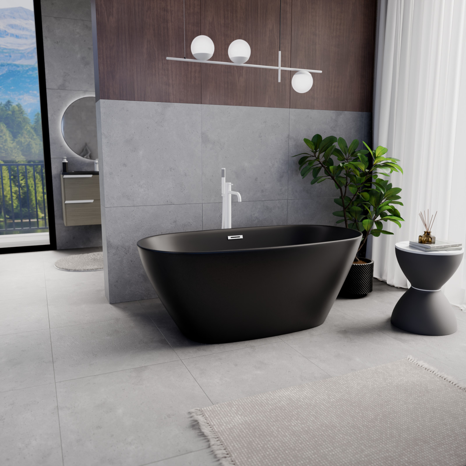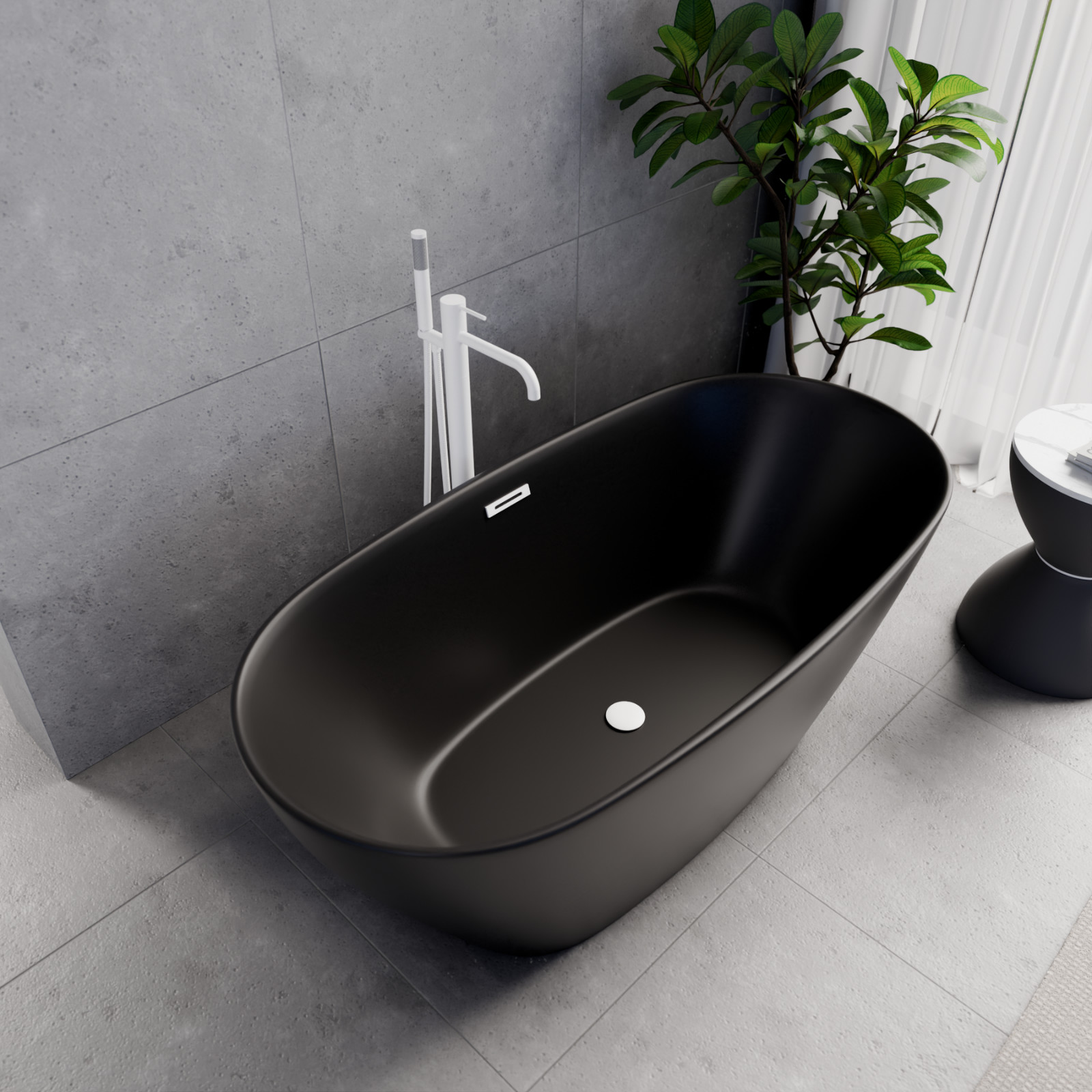Ovális formájú térben álló matt fekete akril kád tükörsima felülettel, amely egy kiváló minőségű és egyedi stílusú fürdőszobai luxus termék matt fehér túlfolyóval és click-clack leeresztővel.