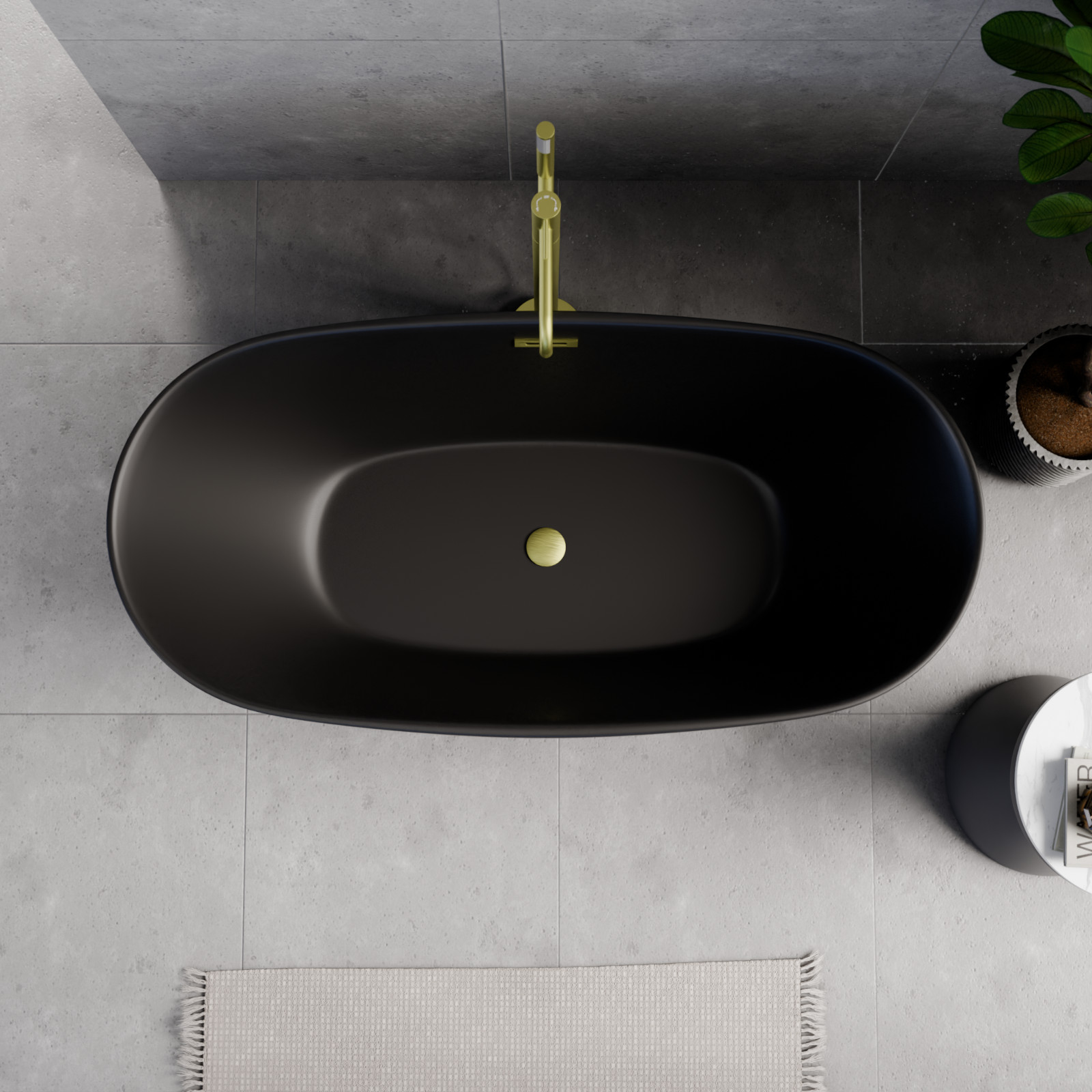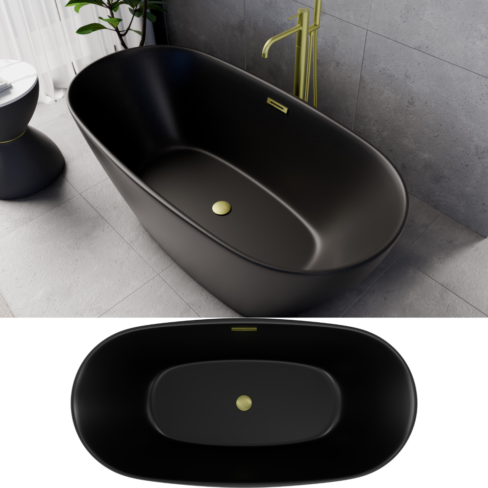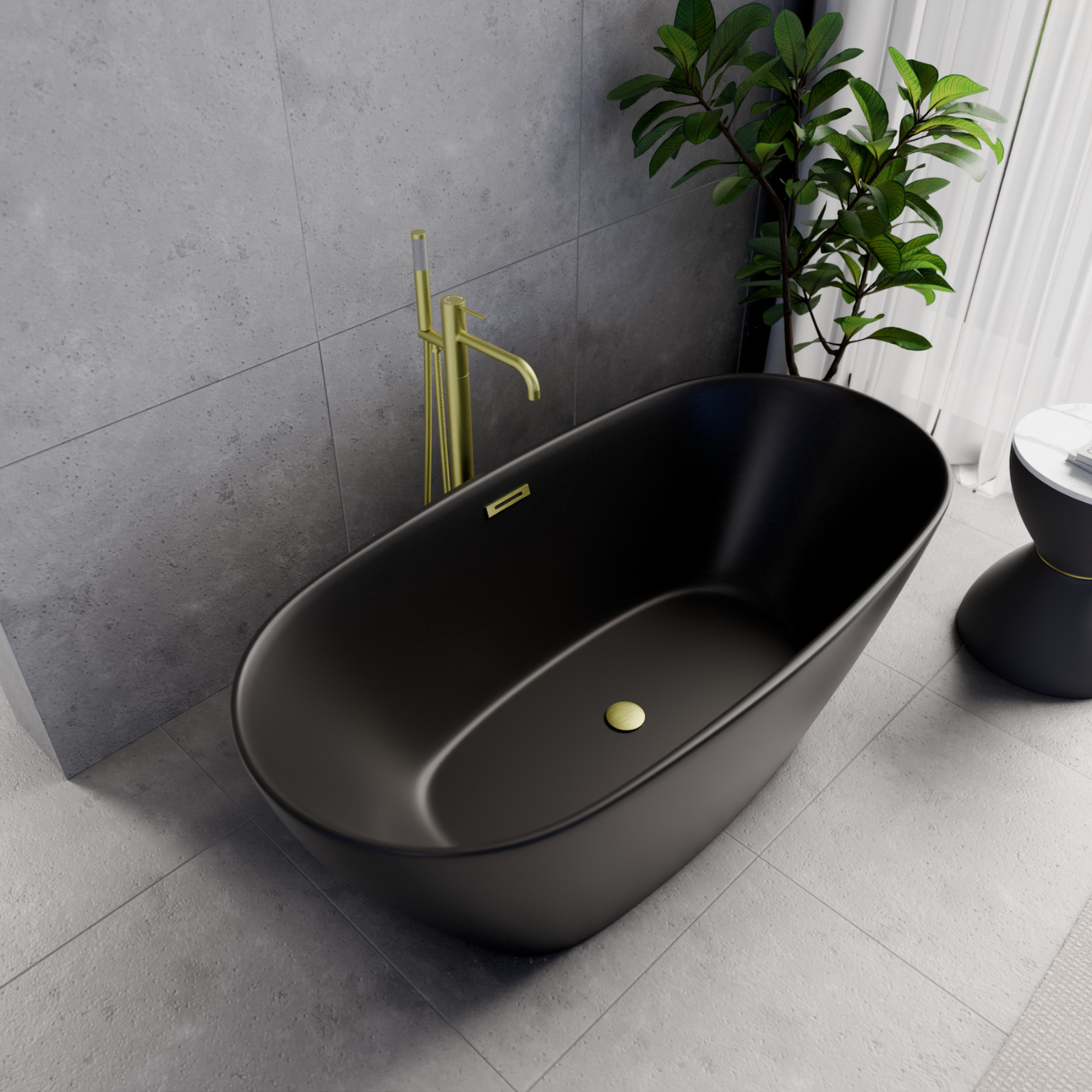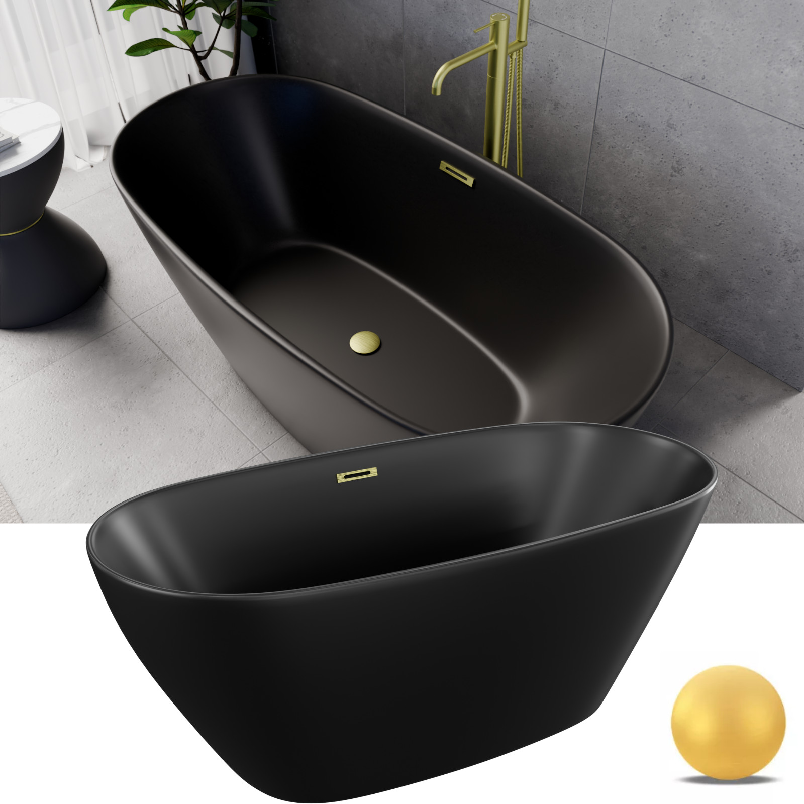 Aurora Matt Black ovális térben álló akril kád, 150 cm hosszú, szálcsiszolt arany elemekkel