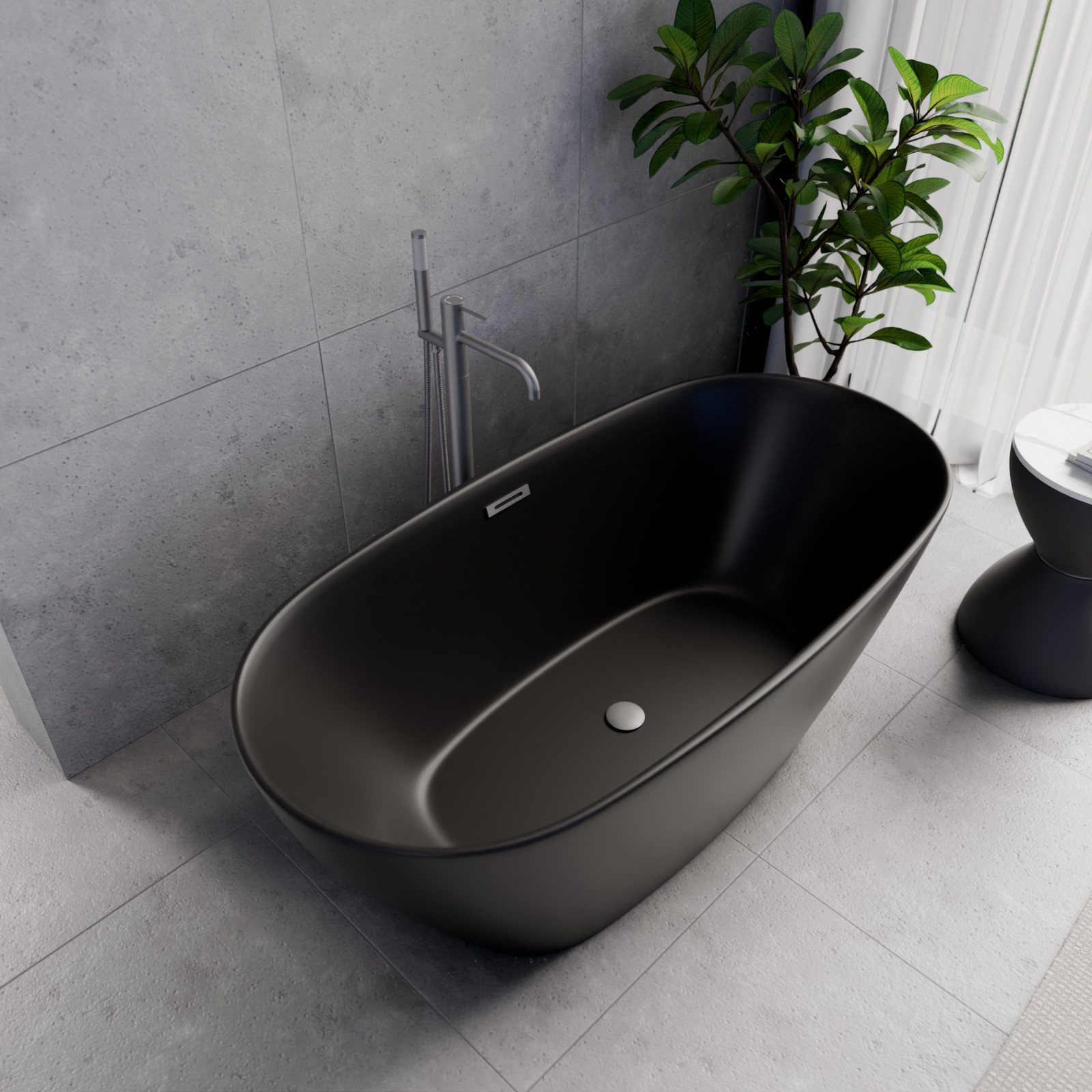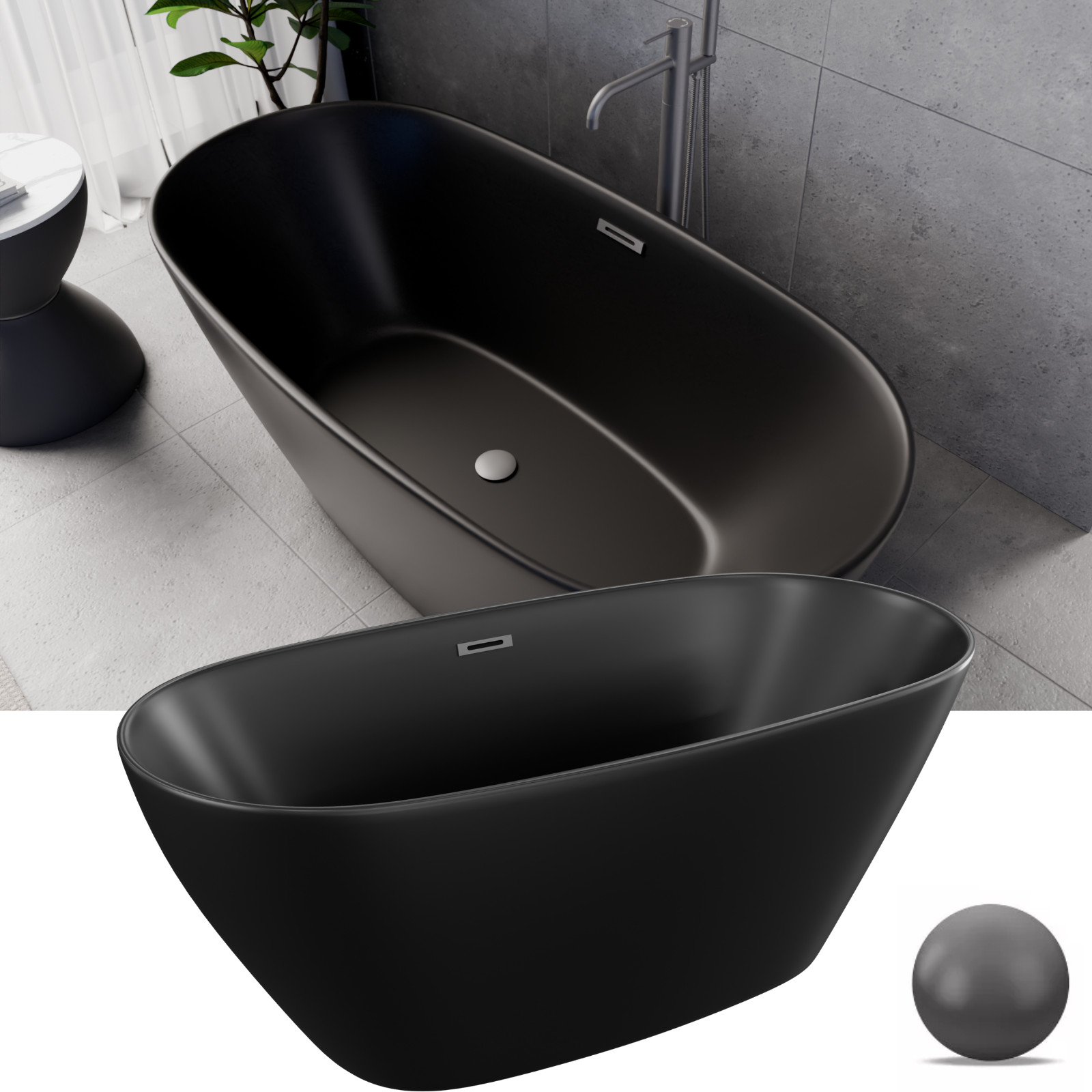 Aurora Matt Black ovális térben álló akril kád, 150 cm hosszú, szürke elemekkel