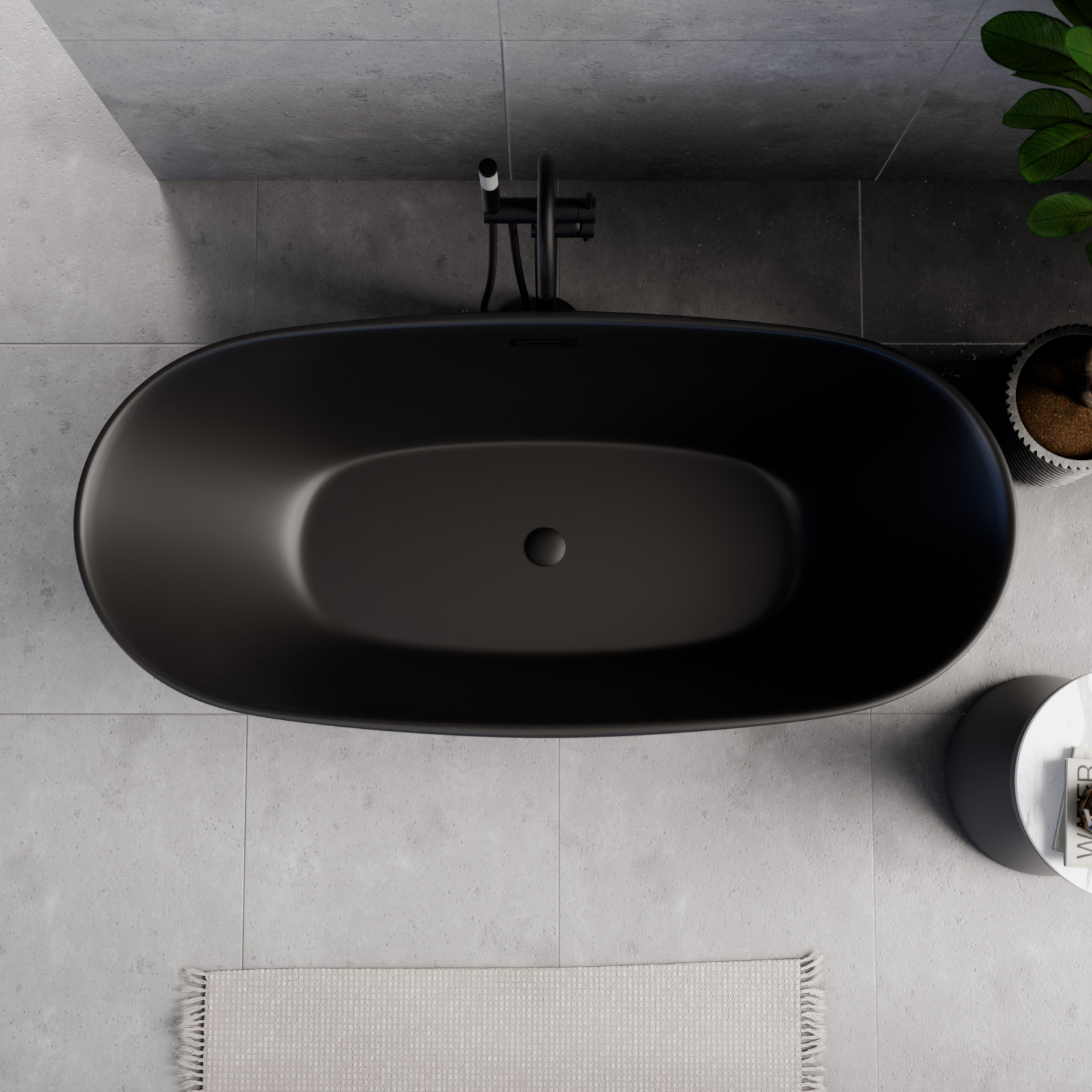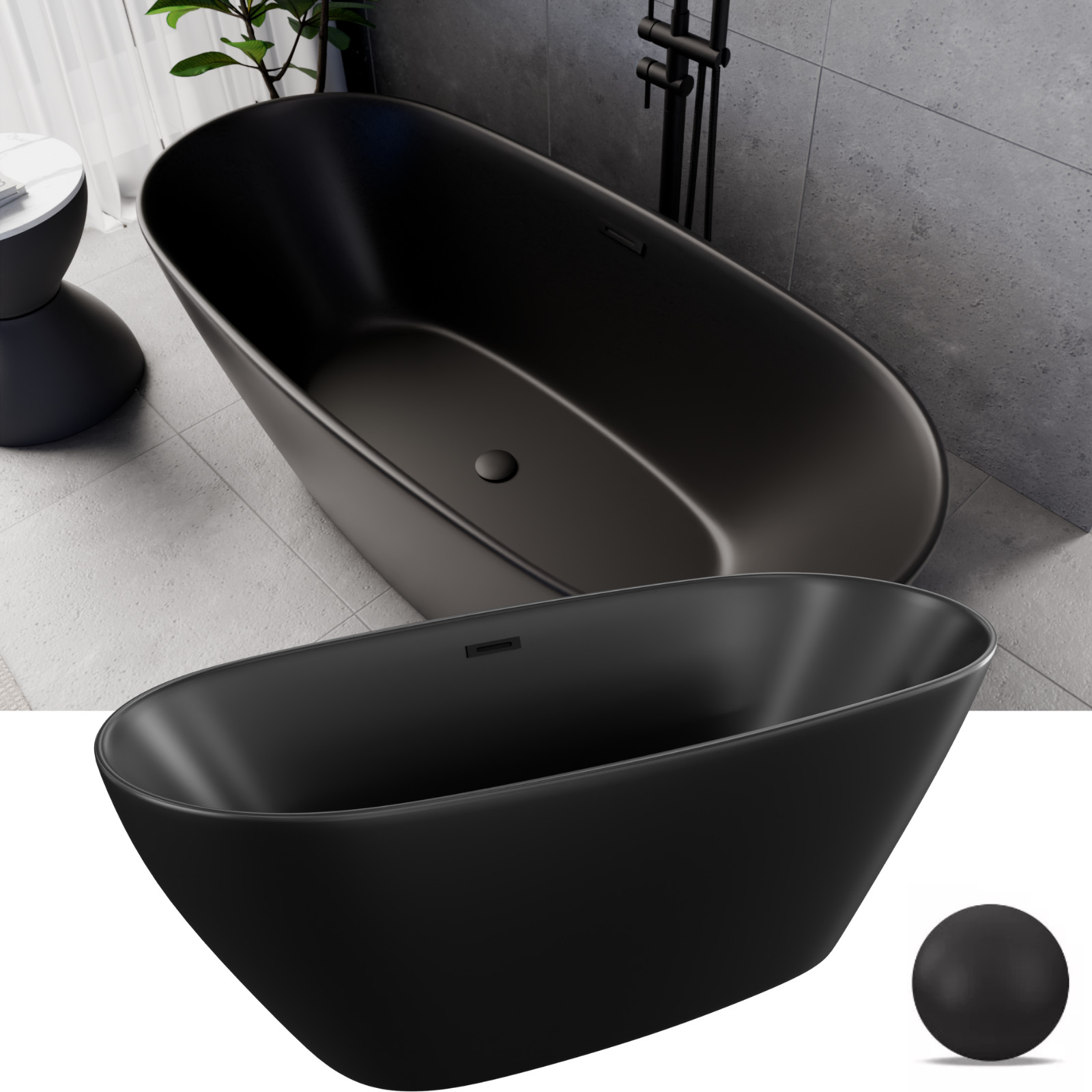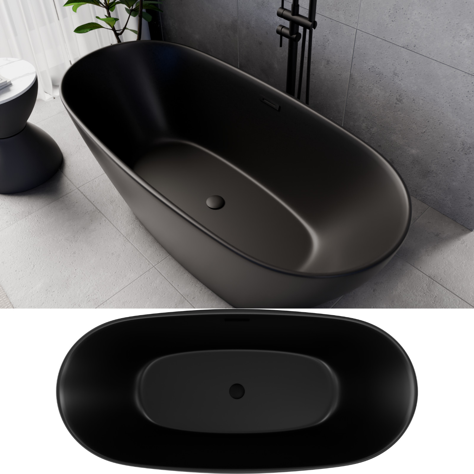HD Aurora Matt Black 160x75 ovális térben álló akril kád matt fekete túlfolyóval és click-clack leeresztővel