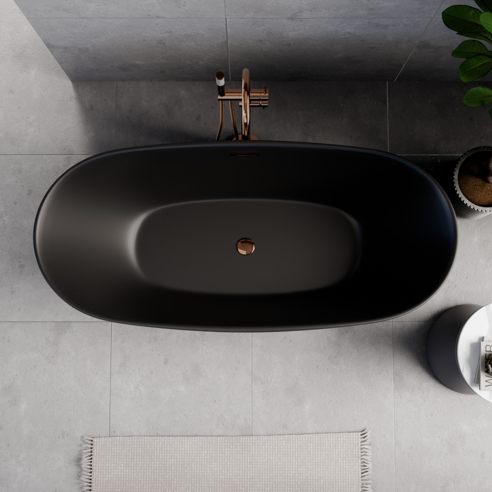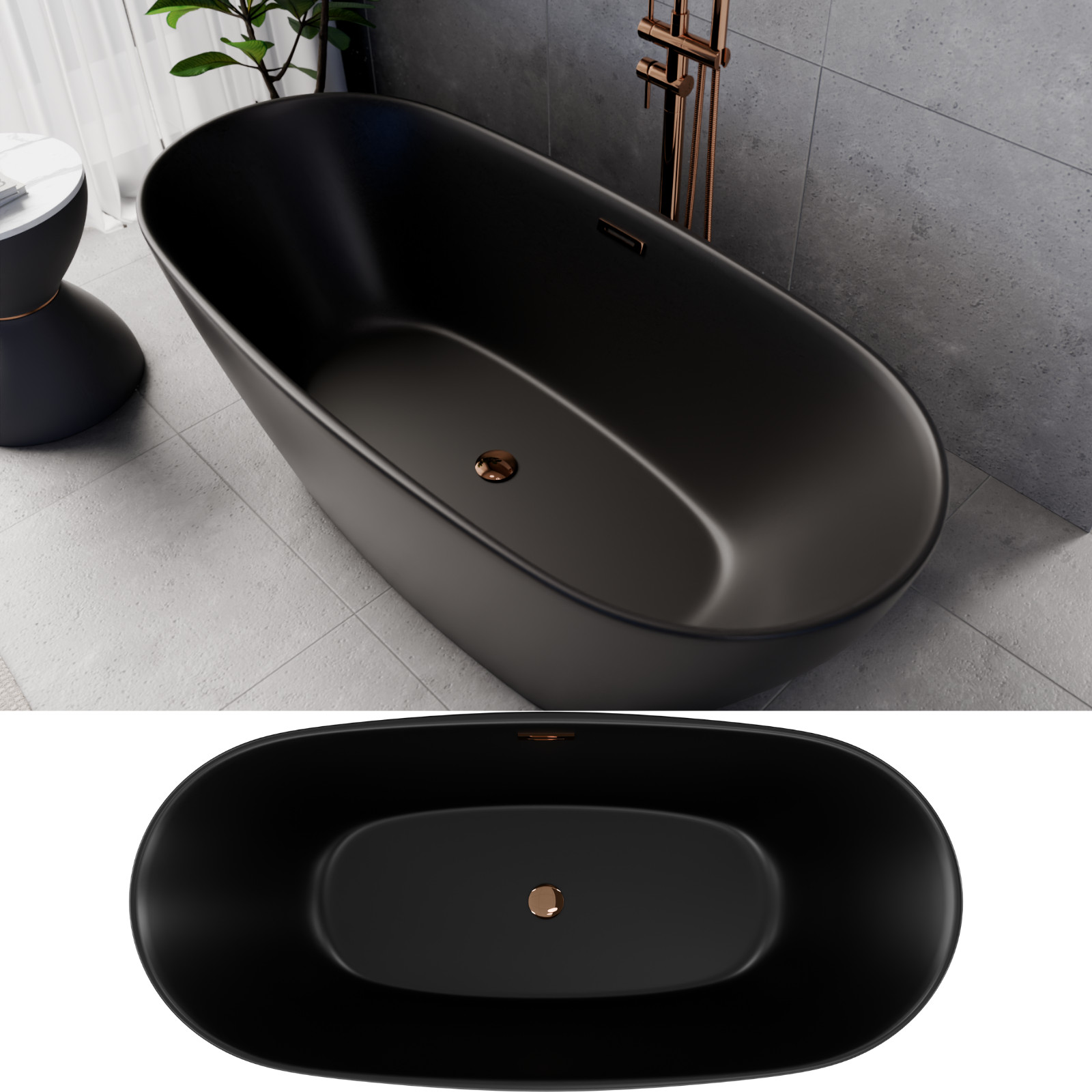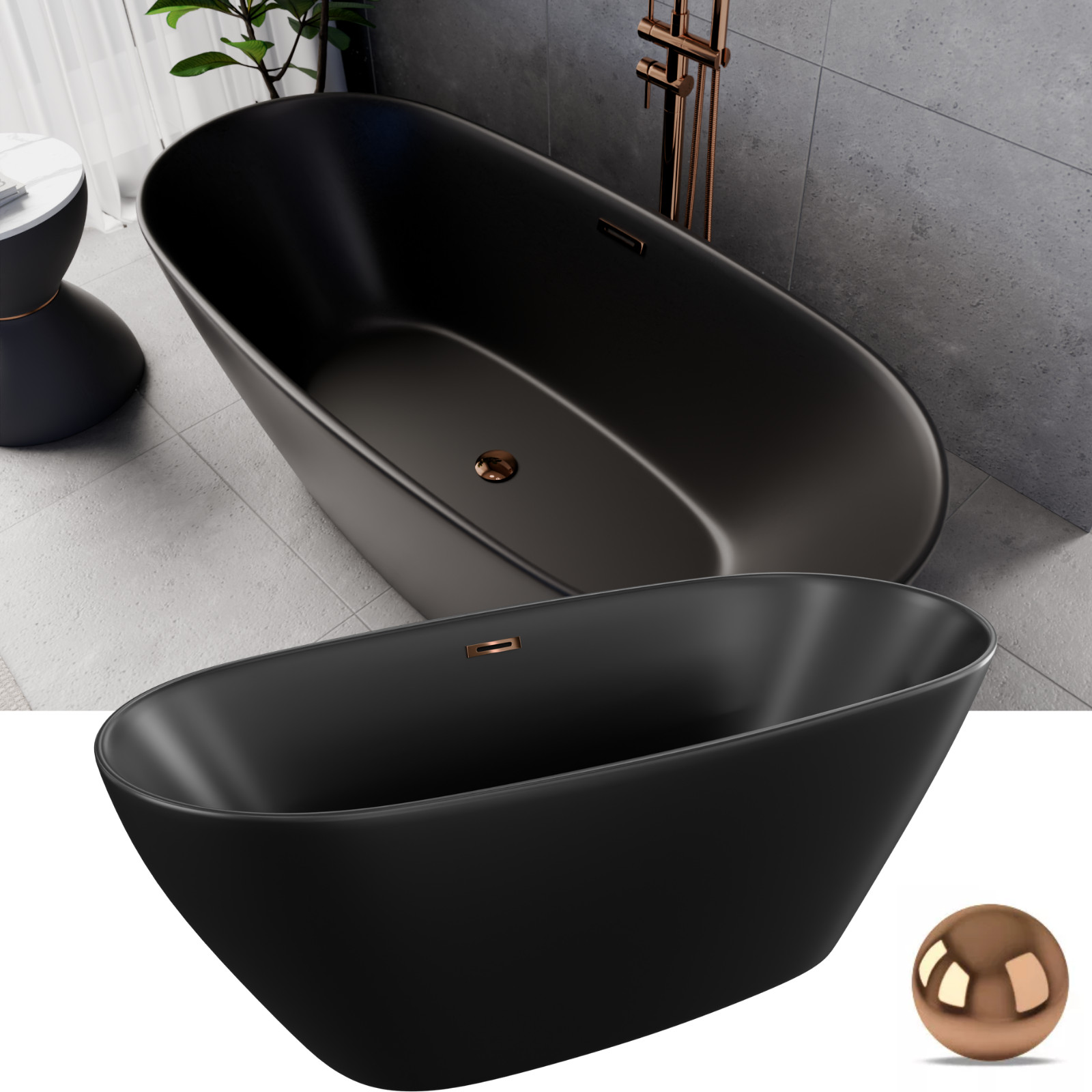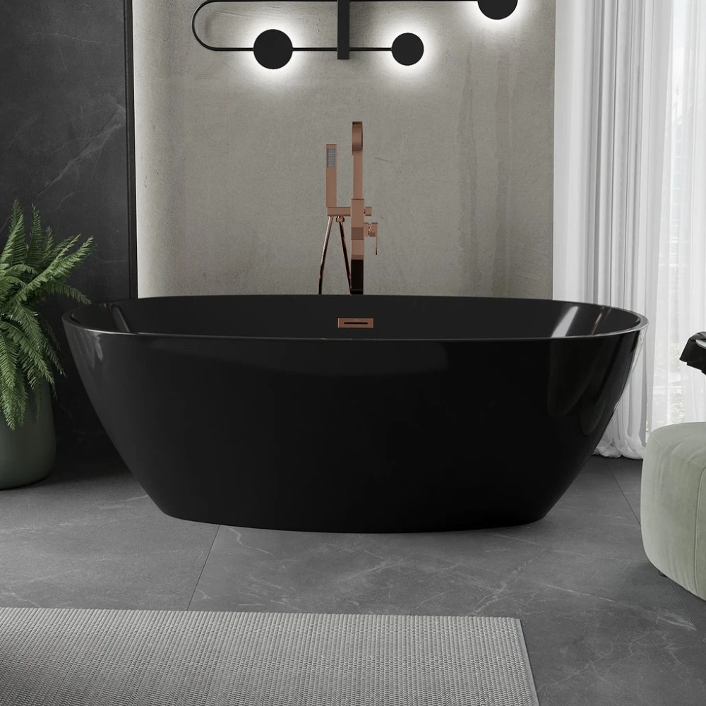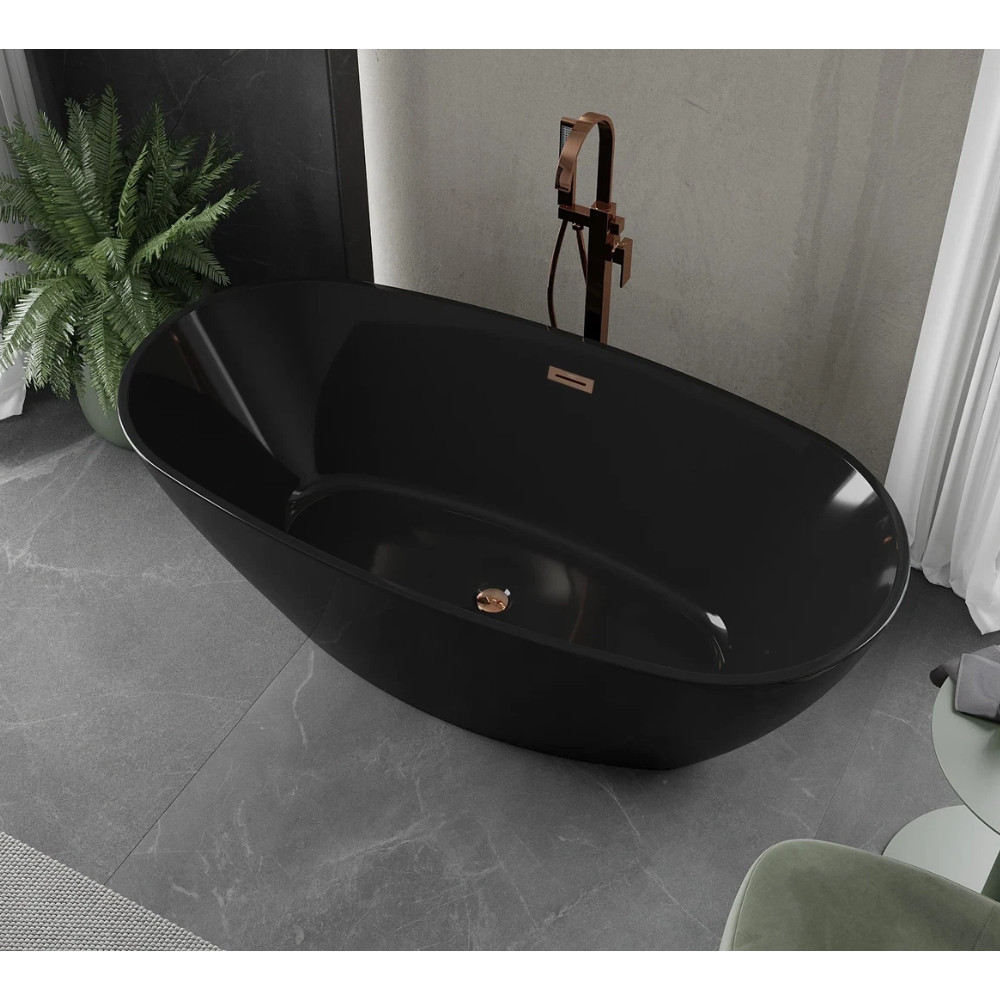 Aurora Matt Black ovális térben álló akril kád, 160 cm hosszú, rózsa arany elemekkel