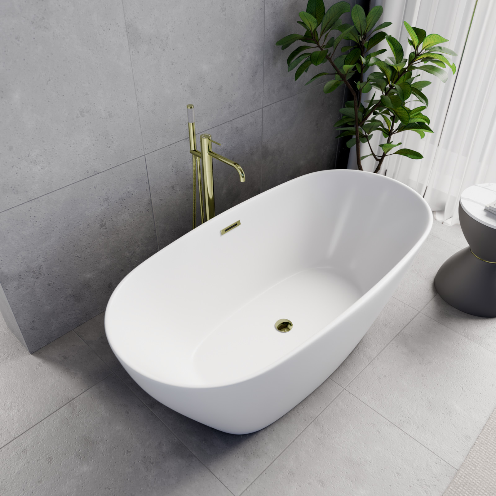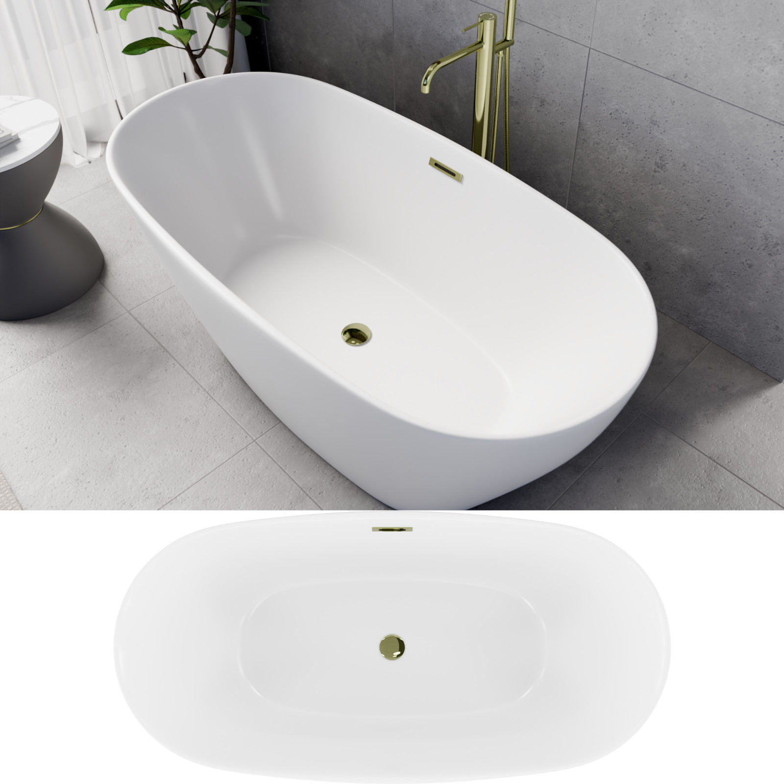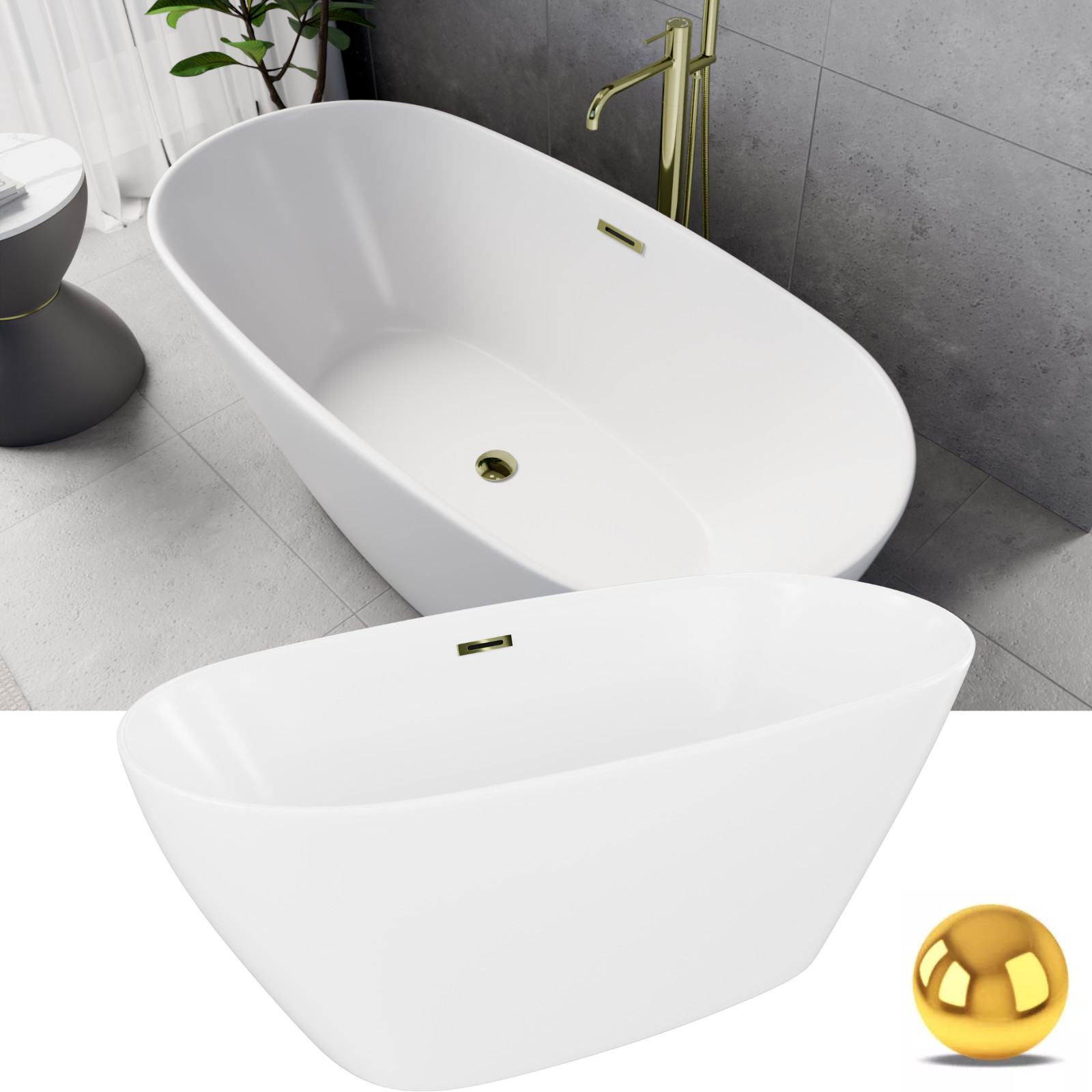 HD Aurora Matt White 150/160/170 cm hosszú ovális térben álló akril kád fényes arany túlfolyóval és click-clack leeresztővel