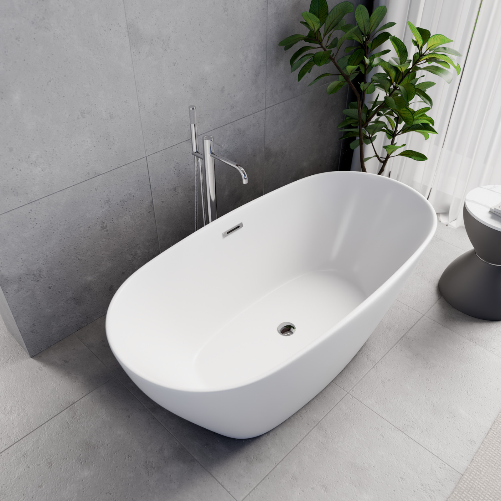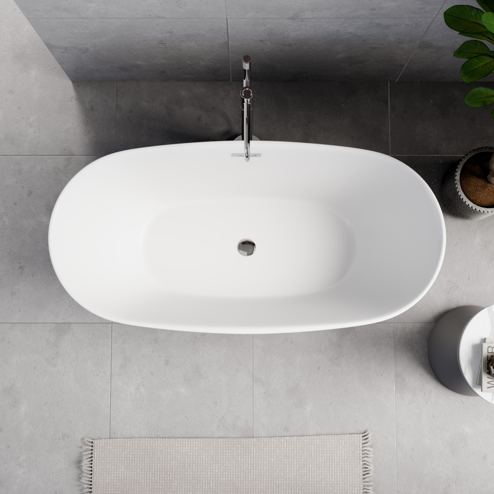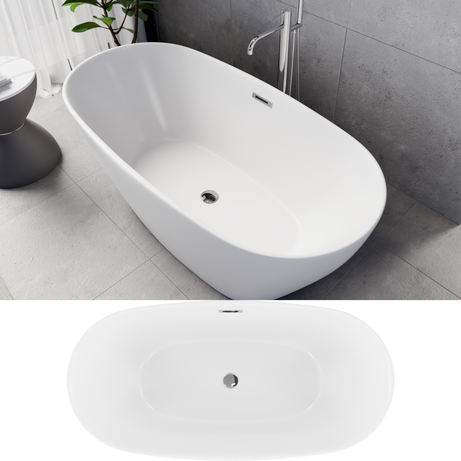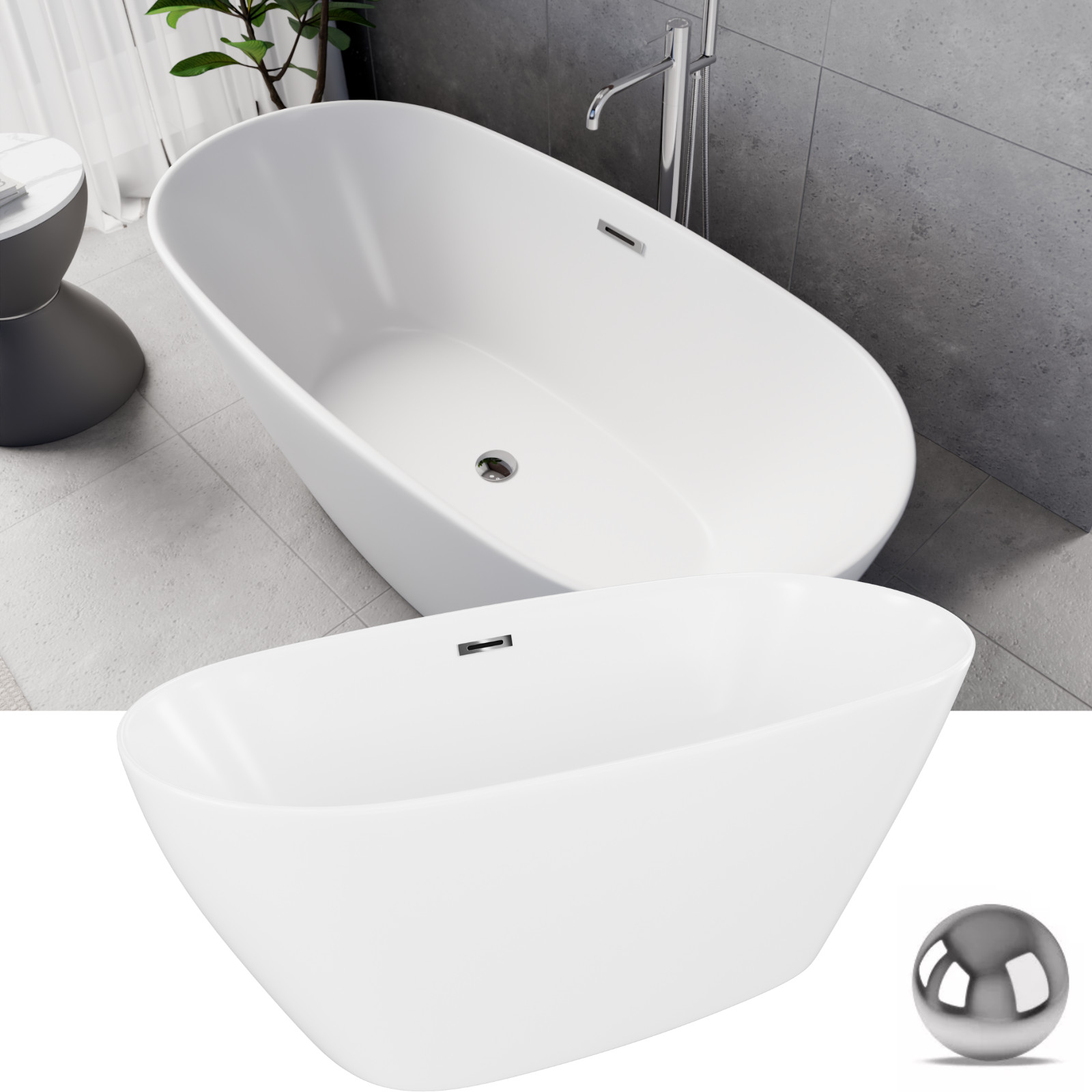 Ovális formájú térben álló hófehér akril kád tükörsima felülettel, amely egy kiváló minőségű és egyedi stílusú fürdőszobai luxus termék króm színű click-clack leeresztővel.