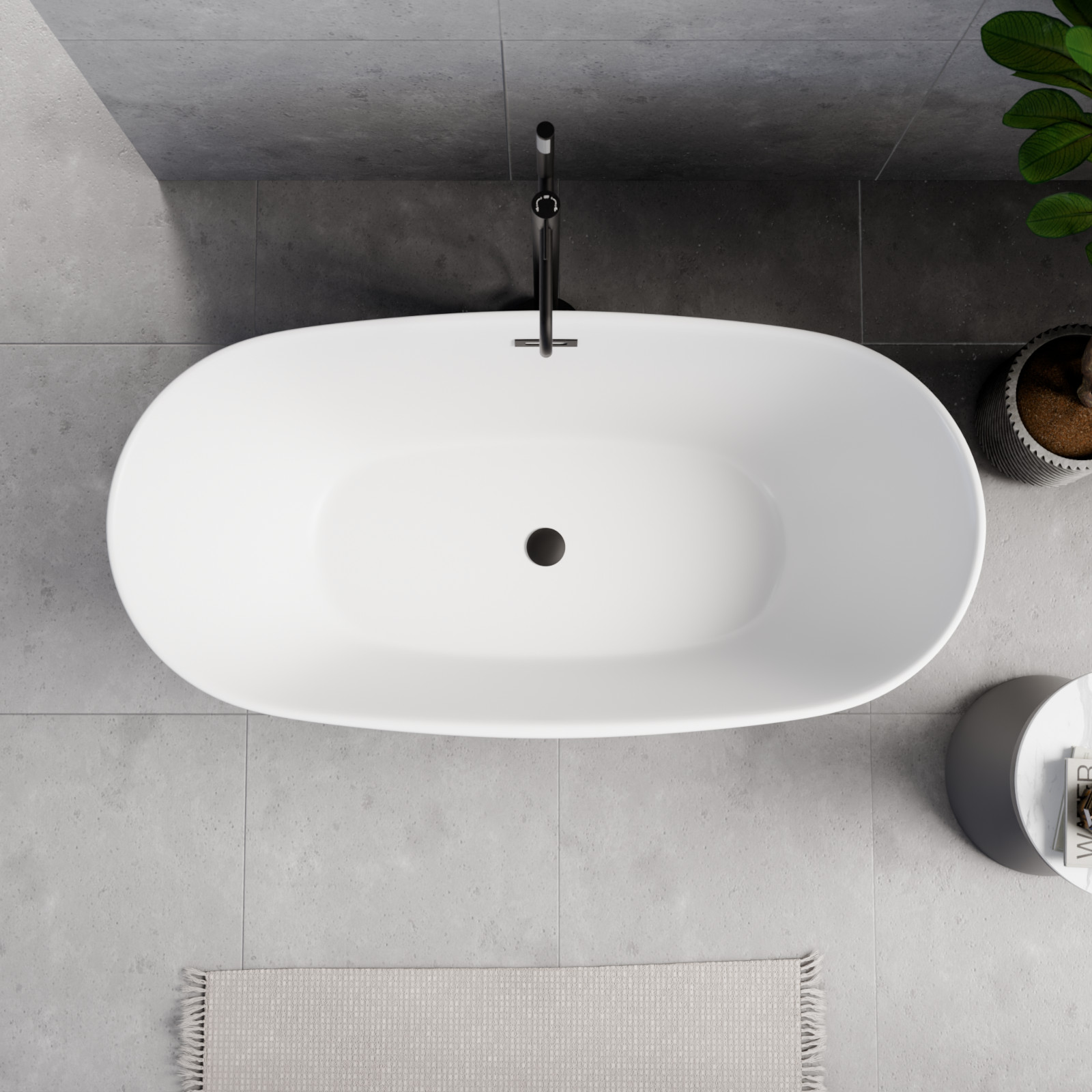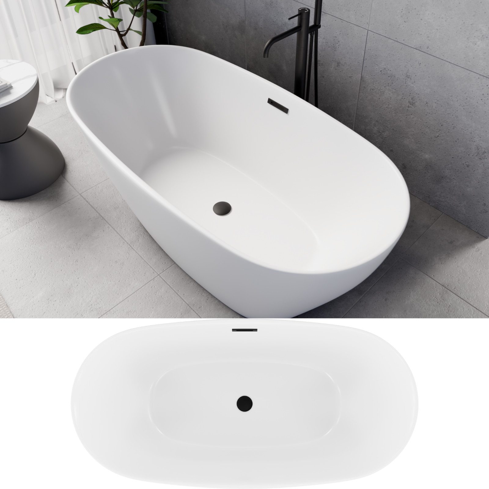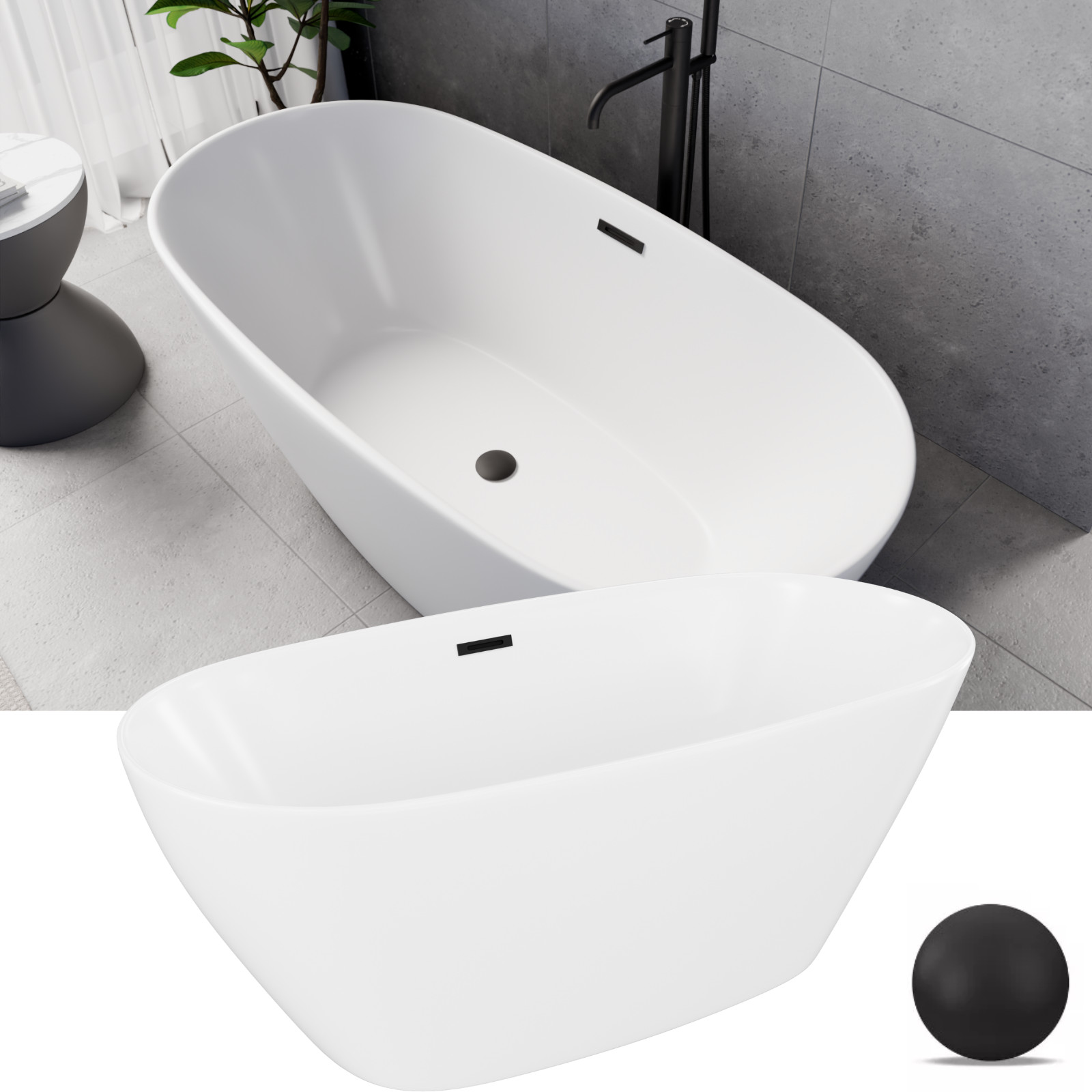 HD Aurora Matt White 150/160/170 cm hosszú ovális térben álló akril kád matt fekete túlfolyóval és click-clack leeresztővel