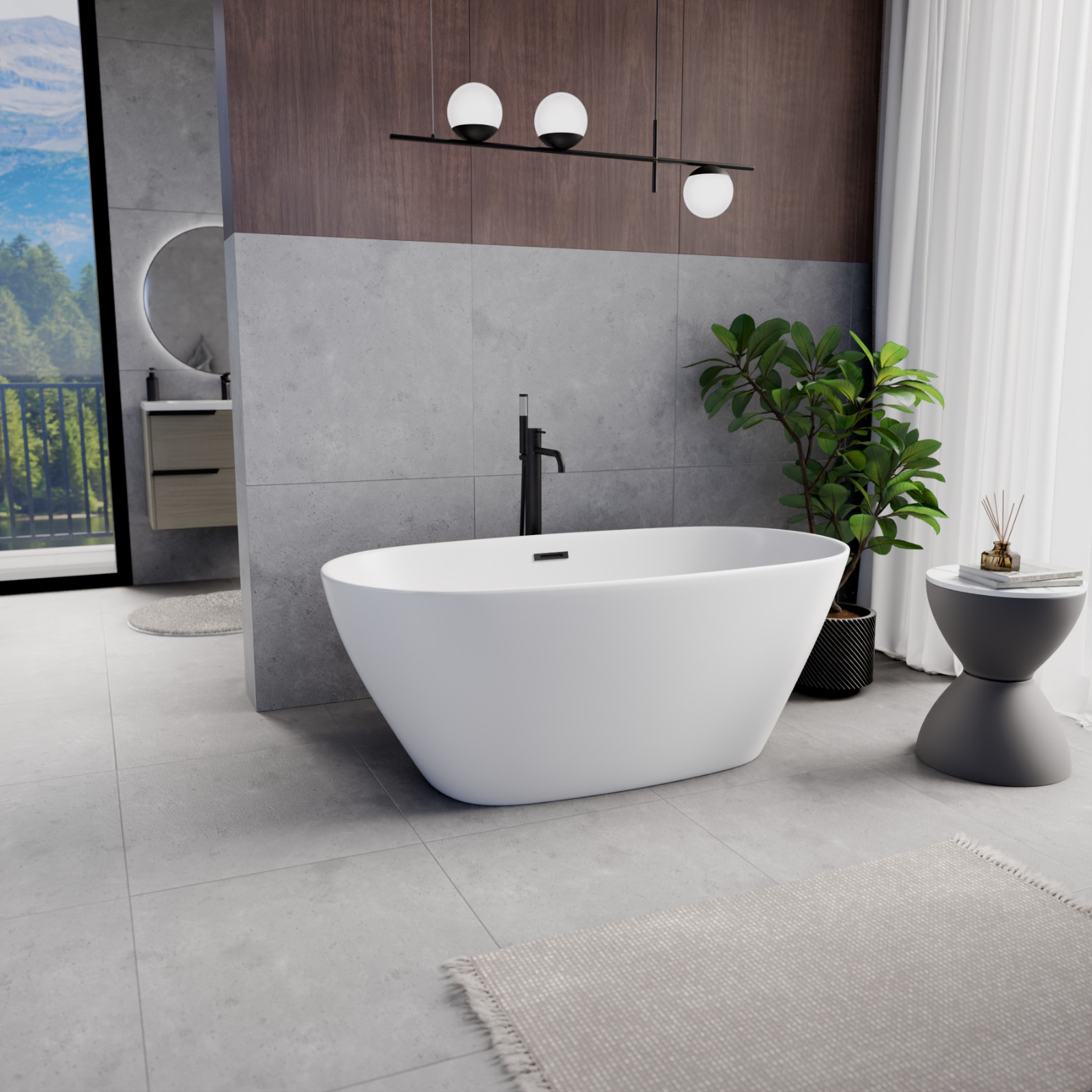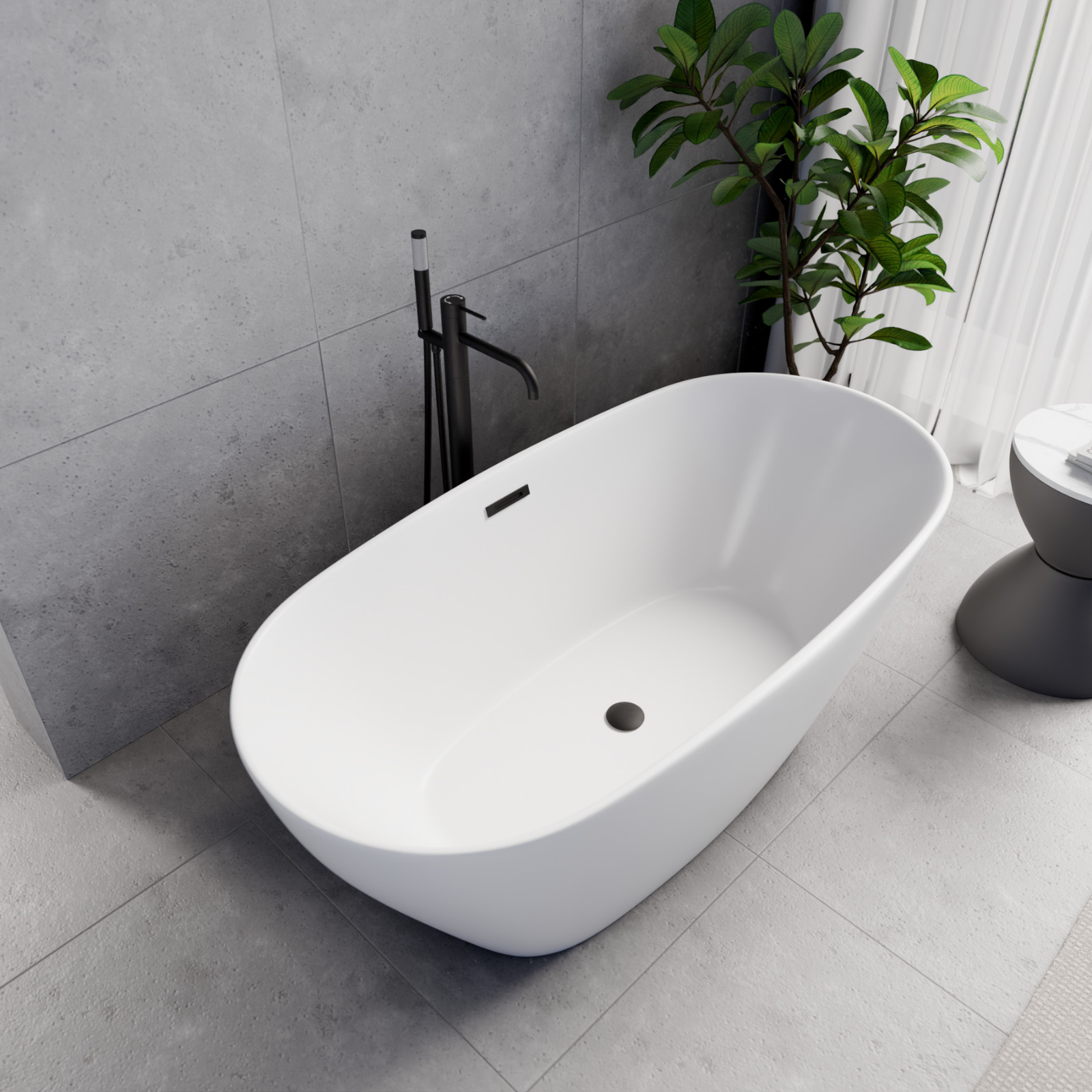 Ovális formájú térben álló hófehér akril kád tükörsima felülettel, amely egy kiváló minőségű és egyedi stílusú fürdőszobai luxus termék matt fekete túlfolyóval és click-clack leeresztővel.