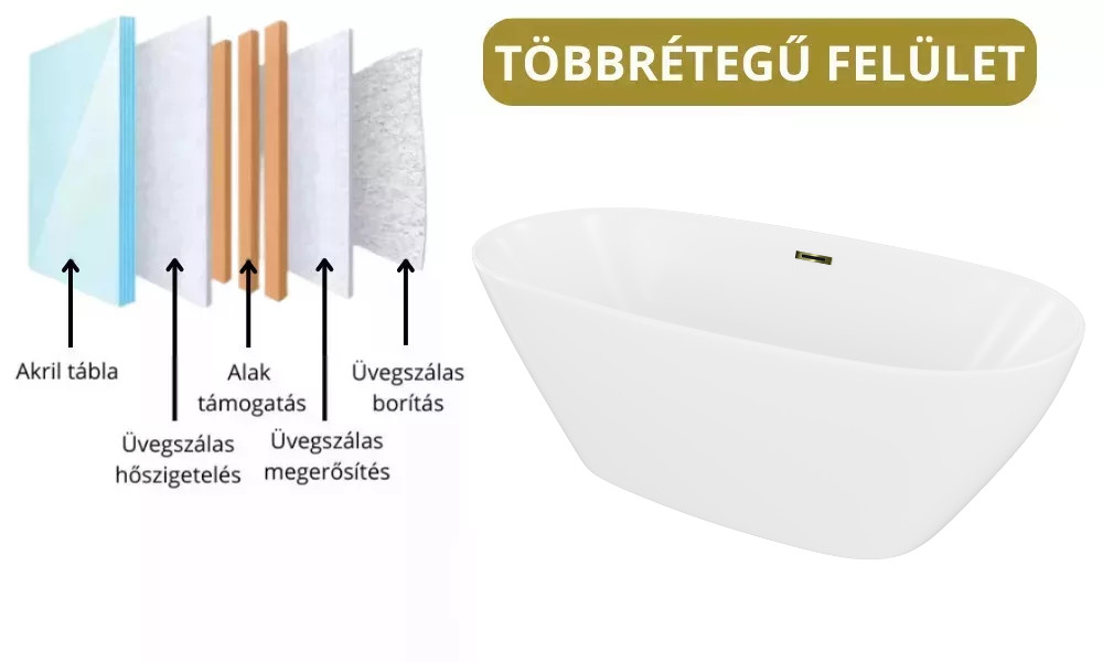 A fürdőkád műgyanta-üvegszálas erősítéssel készítik gyártáskor, aminek köszönhetően rendkívüli hőszigetelő képességgel rendelkezik. Ennek nagy előnye, hogy nem hűti el a vizet a kád felülete, így garantáljuk a hosszan tartó fürdőzést.