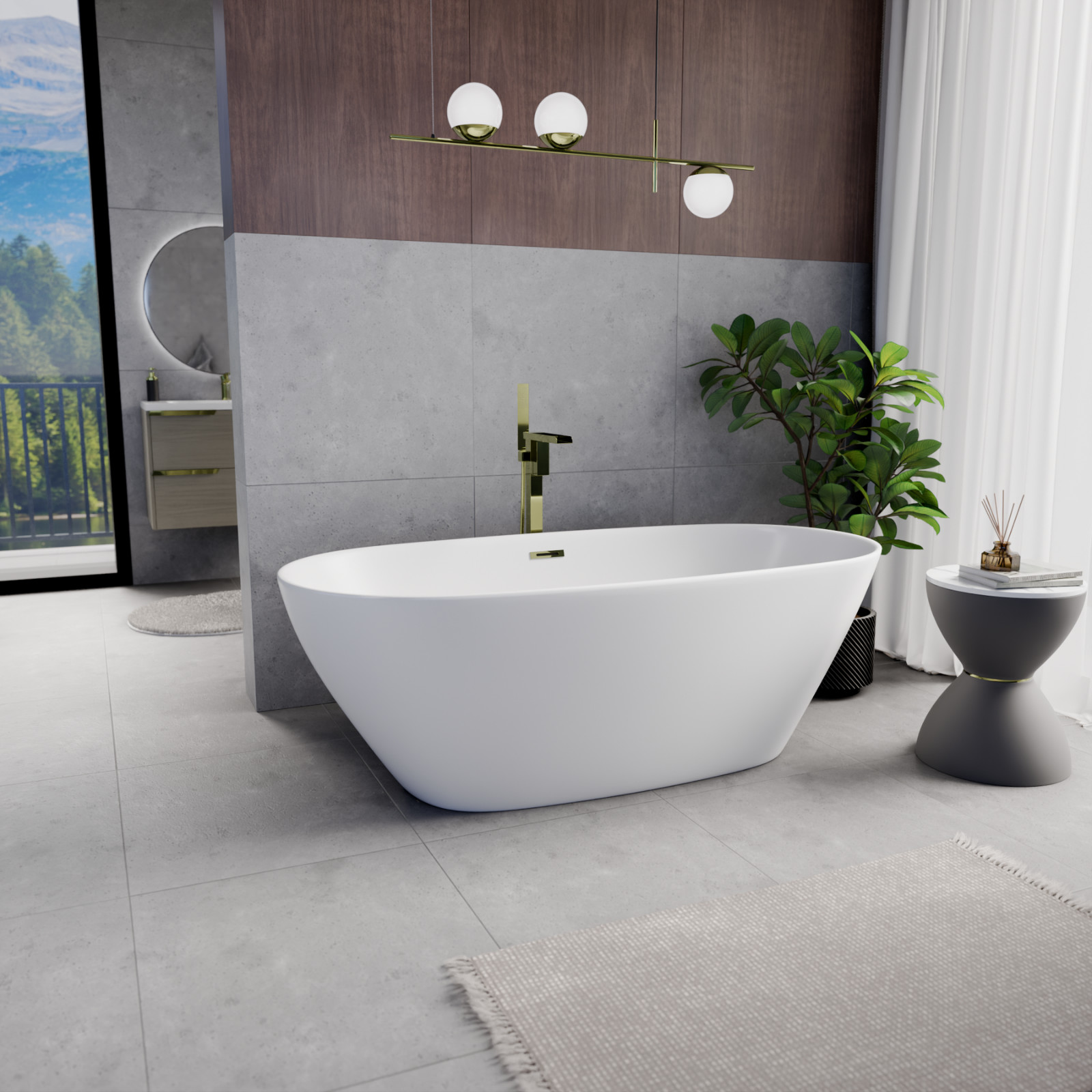 Ovális formájú térben álló hófehér akril kád tükörsima felülettel, amely egy kiváló minőségű és egyedi stílusú fürdőszobai luxus termék fényes arany túlfolyóval és click-clack leeresztővel.