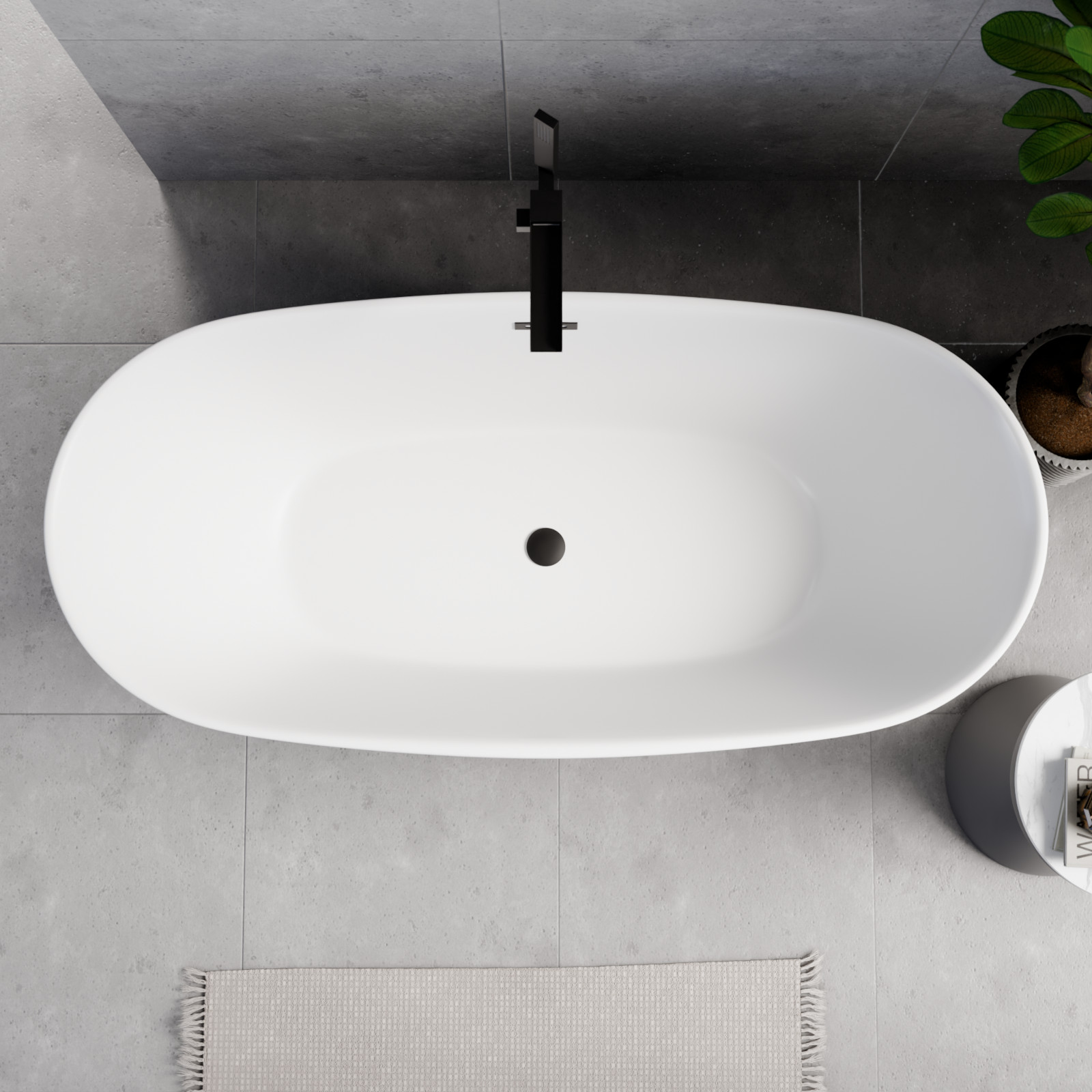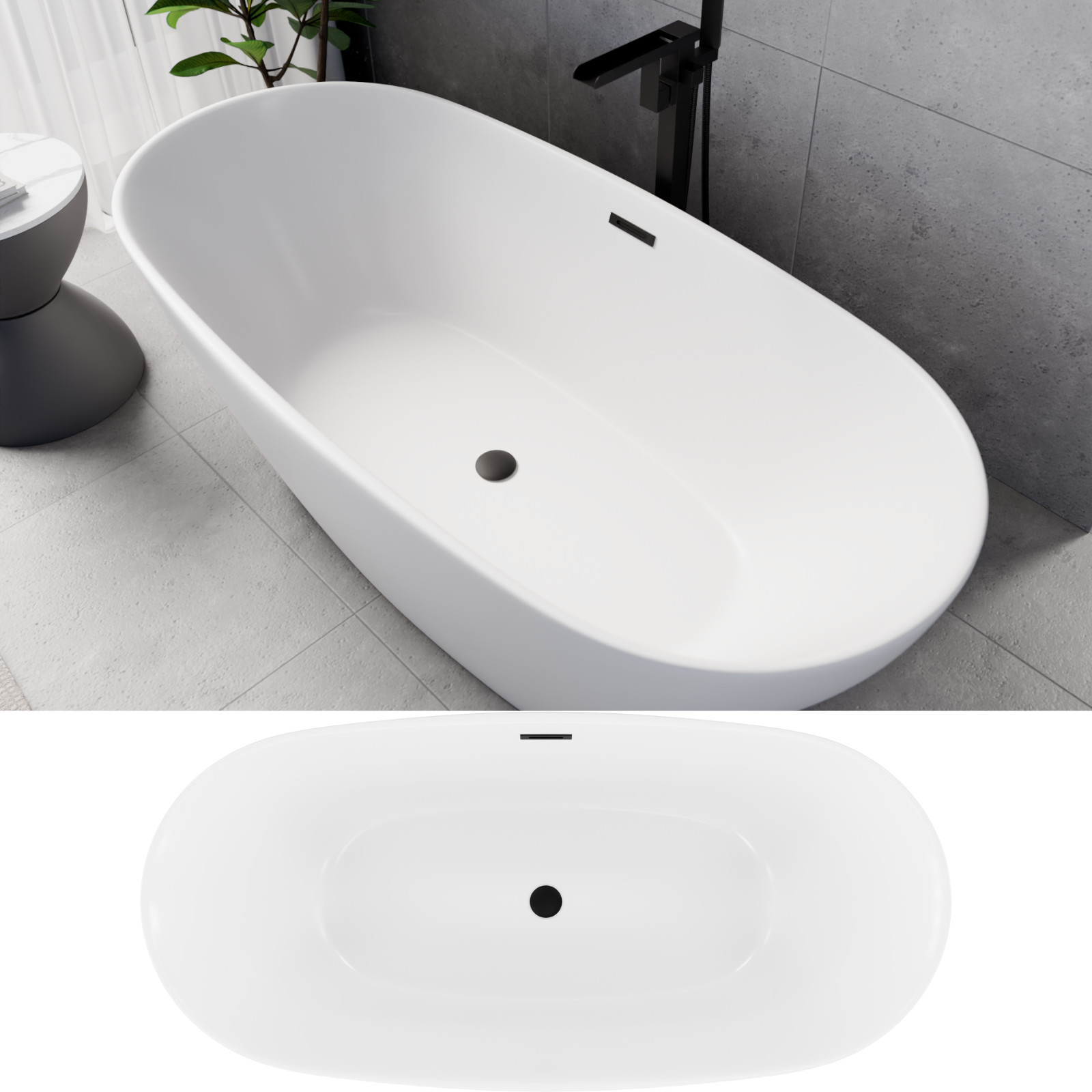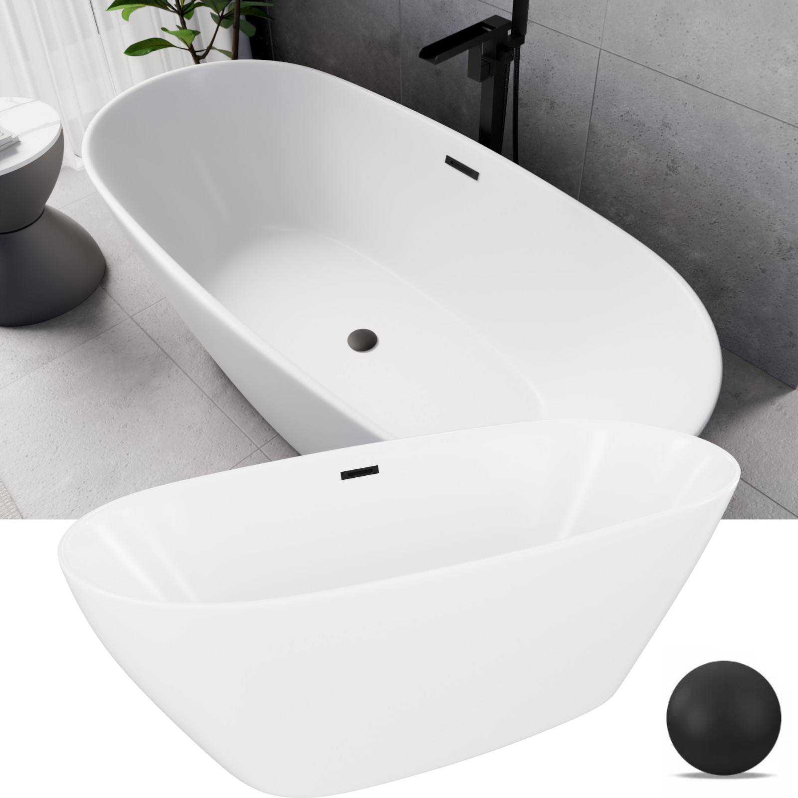 HD Aurora Matt White 170x75 ovális térben álló akril kád matt fekete túlfolyóval és click-clack leeresztővel