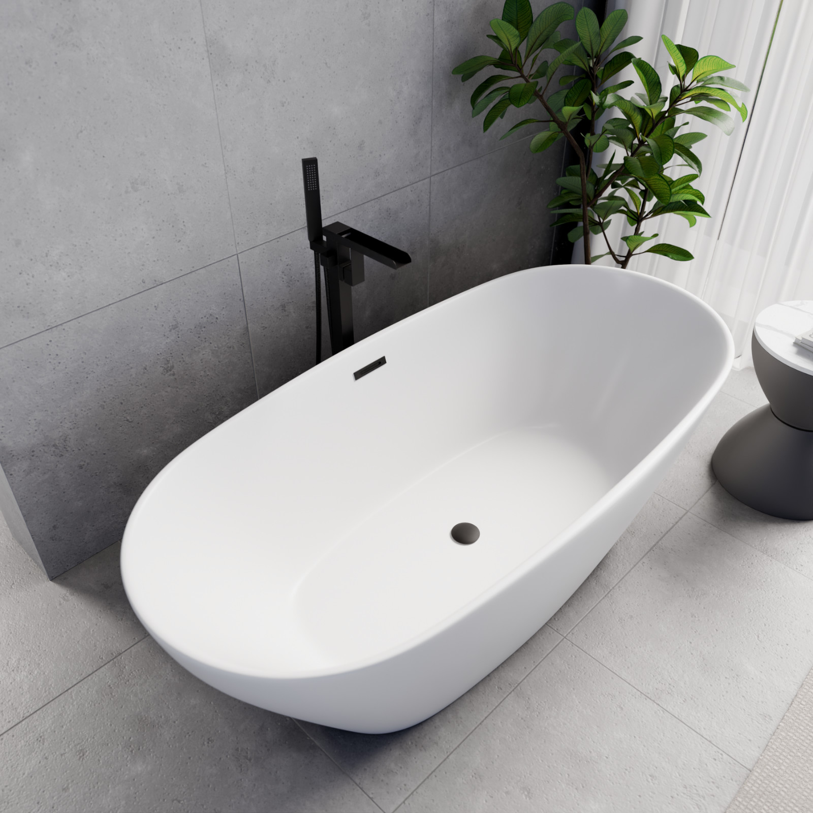Ovális formájú térben álló hófehér akril kád tükörsima felülettel, amely egy kiváló minőségű és egyedi stílusú fürdőszobai luxus termék matt fekete túlfolyóval és click-clack leeresztővel.