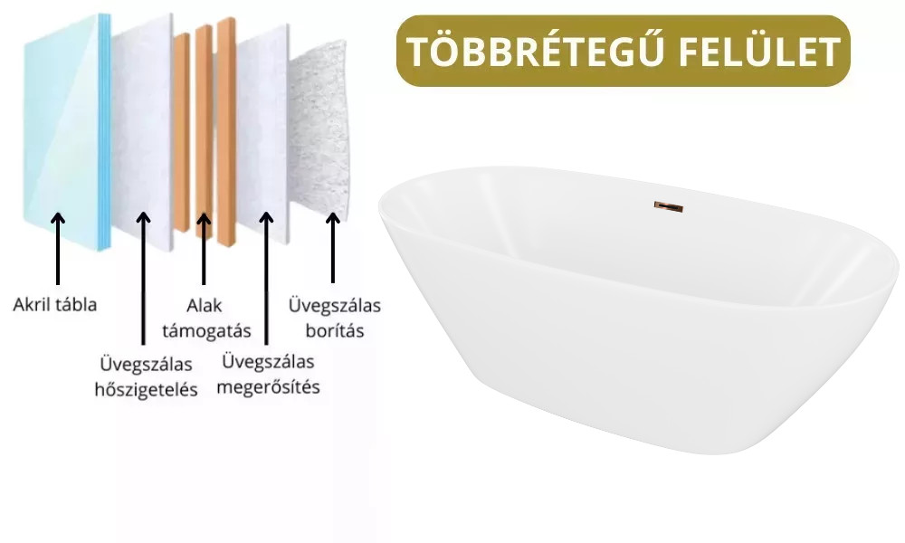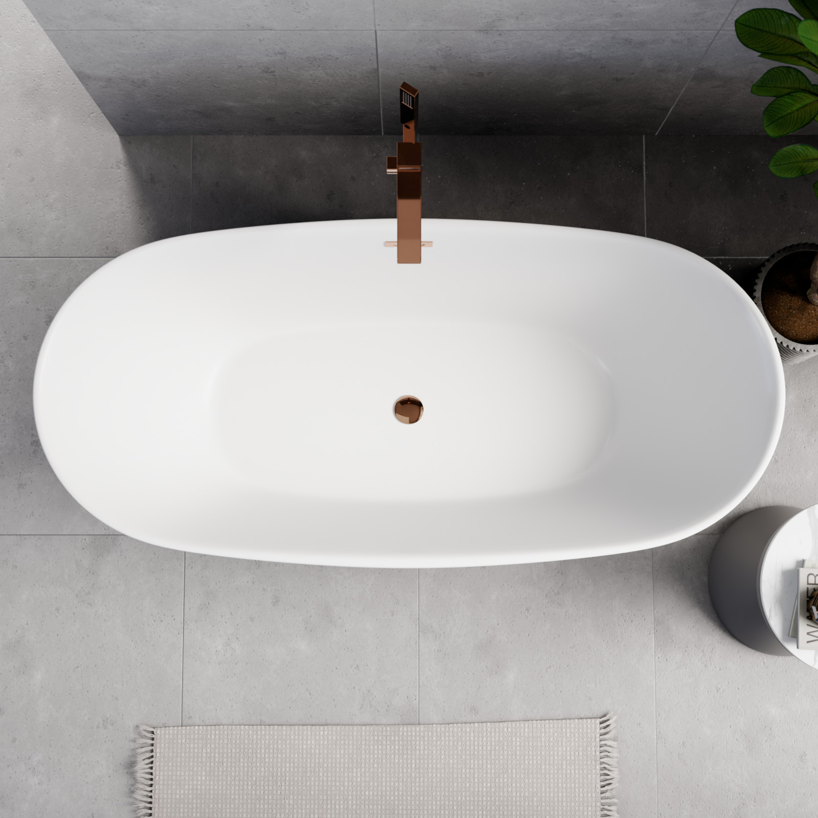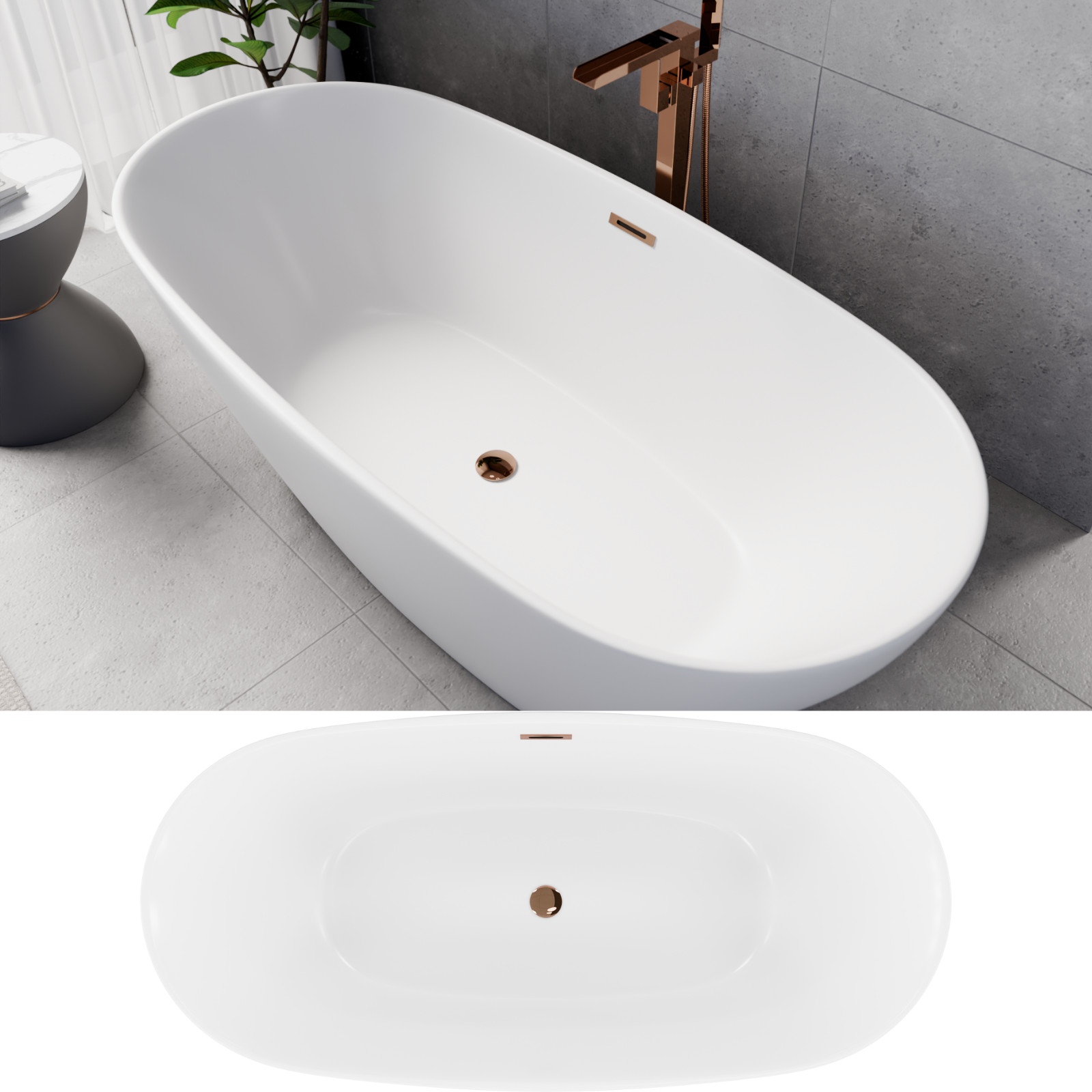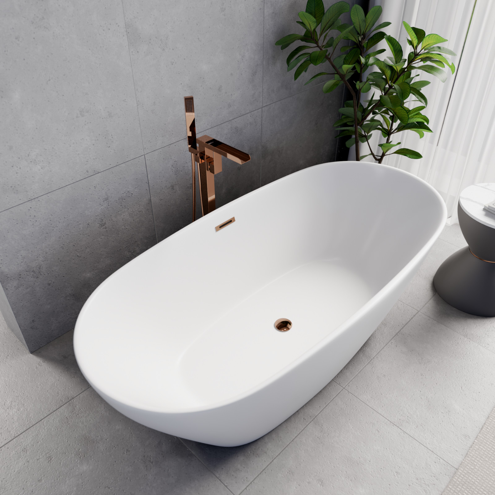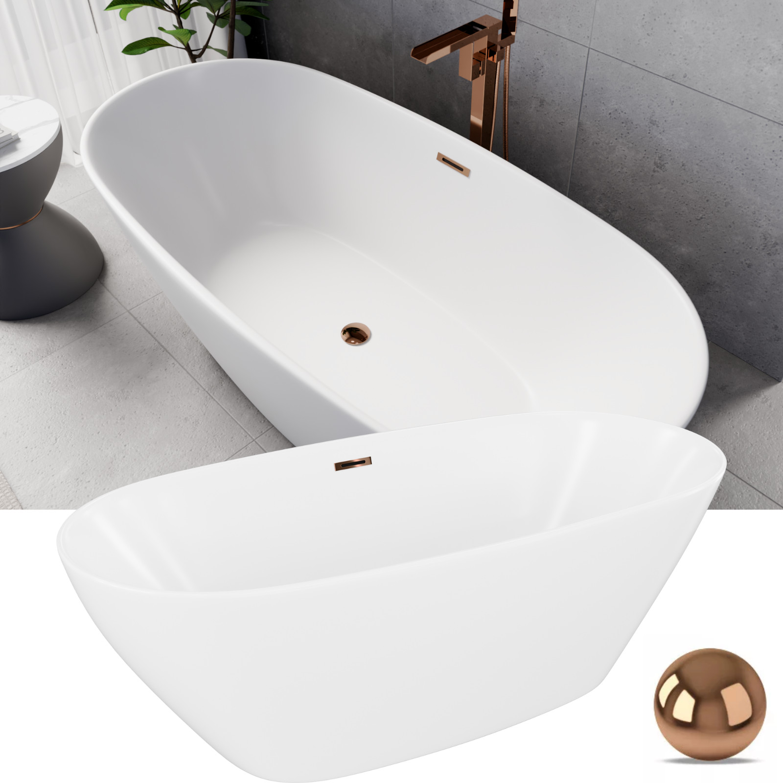 HD Aurora Matt White 170x75 ovális térben álló akril kád rózsa arany túlfolyóval és click-clack leeresztővel