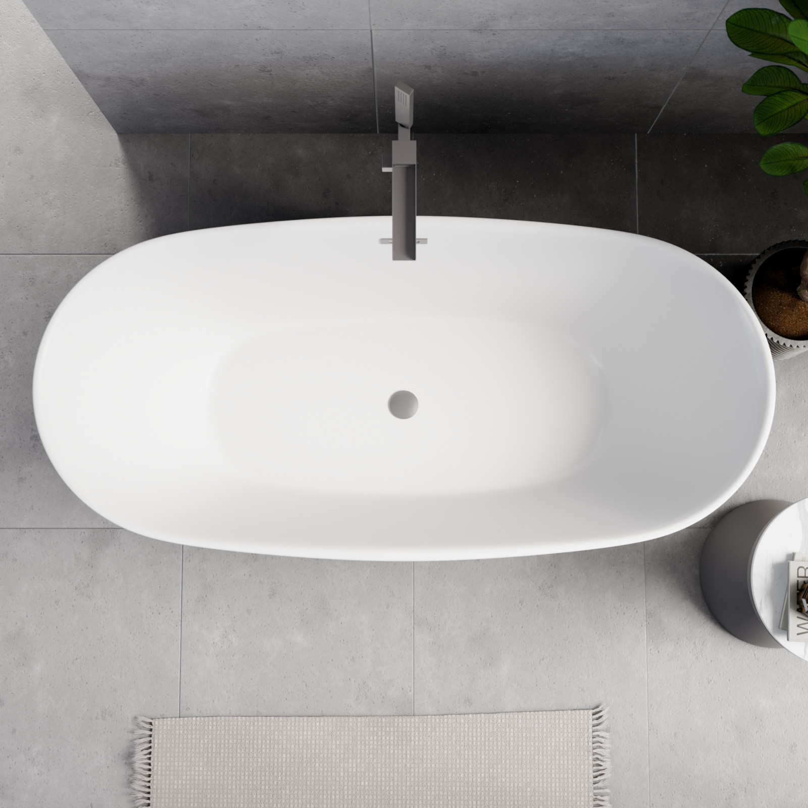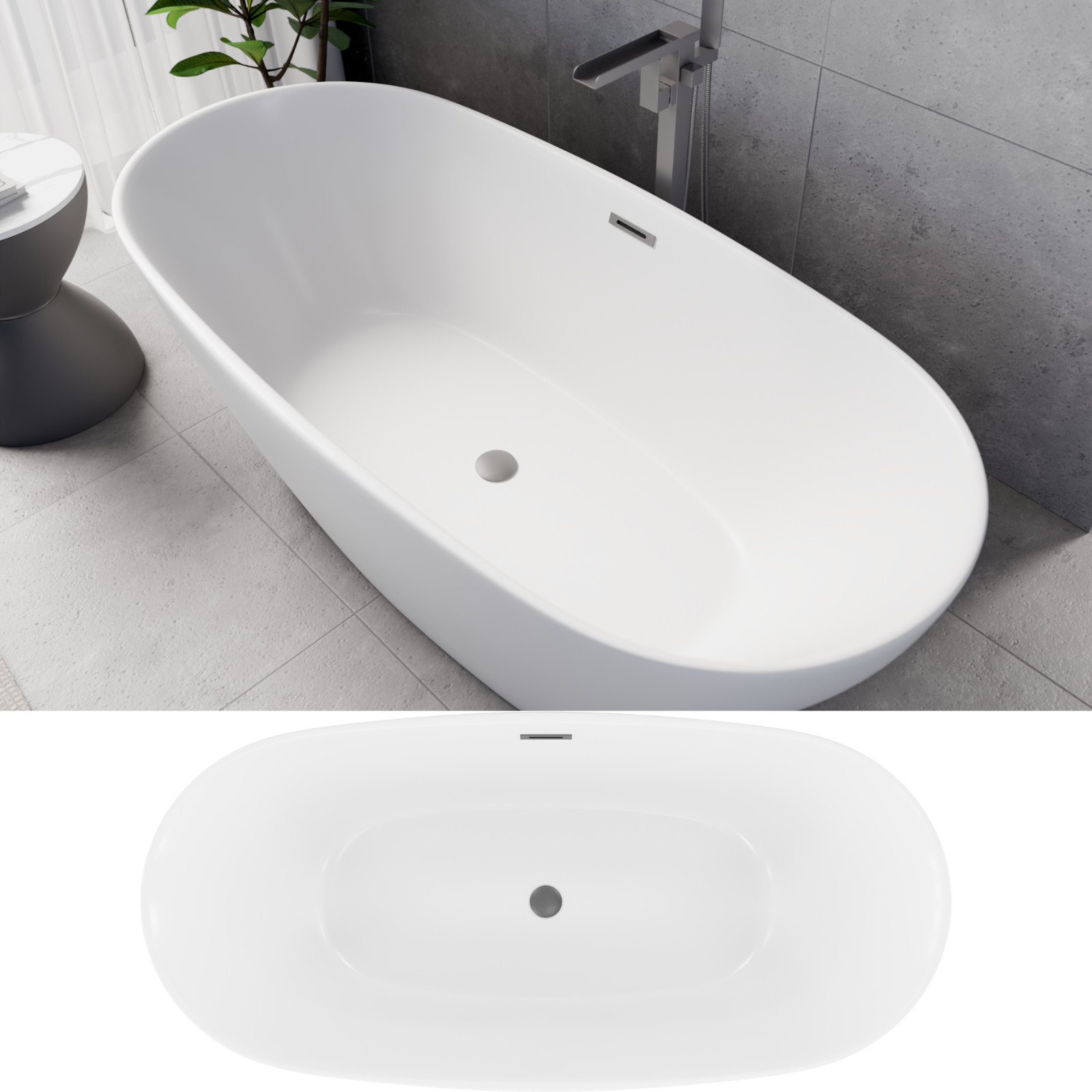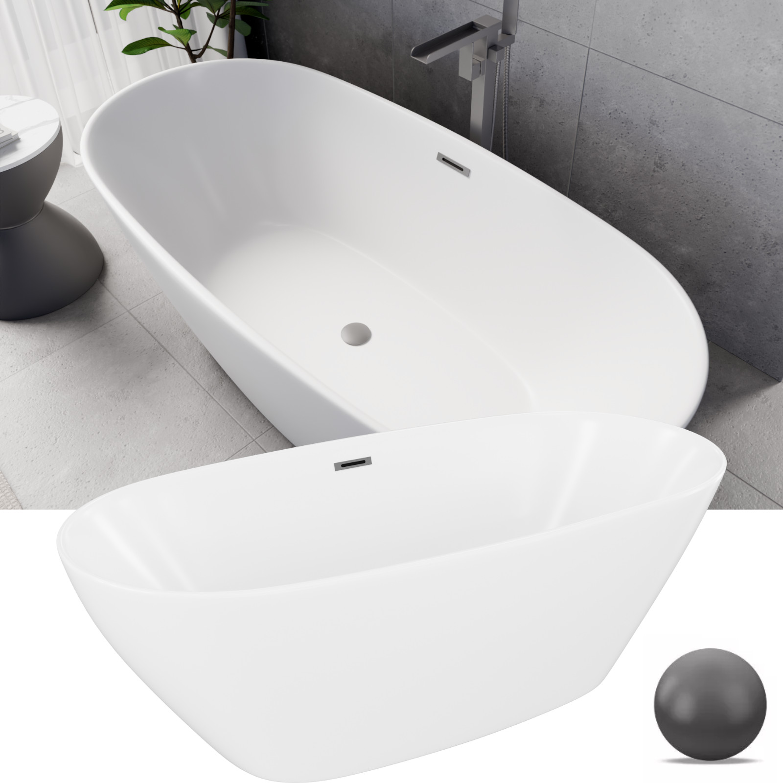 HD Aurora Matt White 170x75 ovális térben álló akril kád szürke túlfolyóval és click-clack leeresztővel