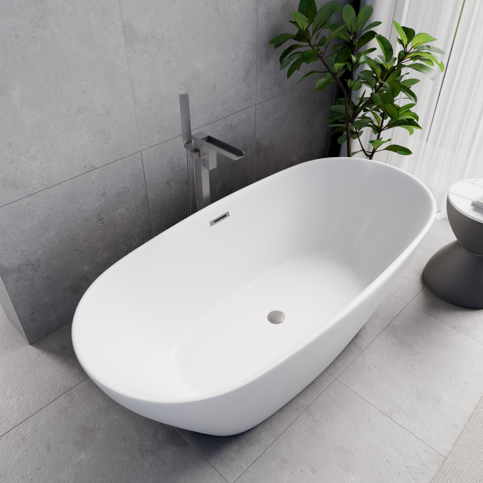 Ovális formájú térben álló hófehér akril kád tükörsima felülettel, amely egy kiváló minőségű és egyedi stílusú fürdőszobai luxus termék szürke túlfolyóval és click-clack leeresztővel.