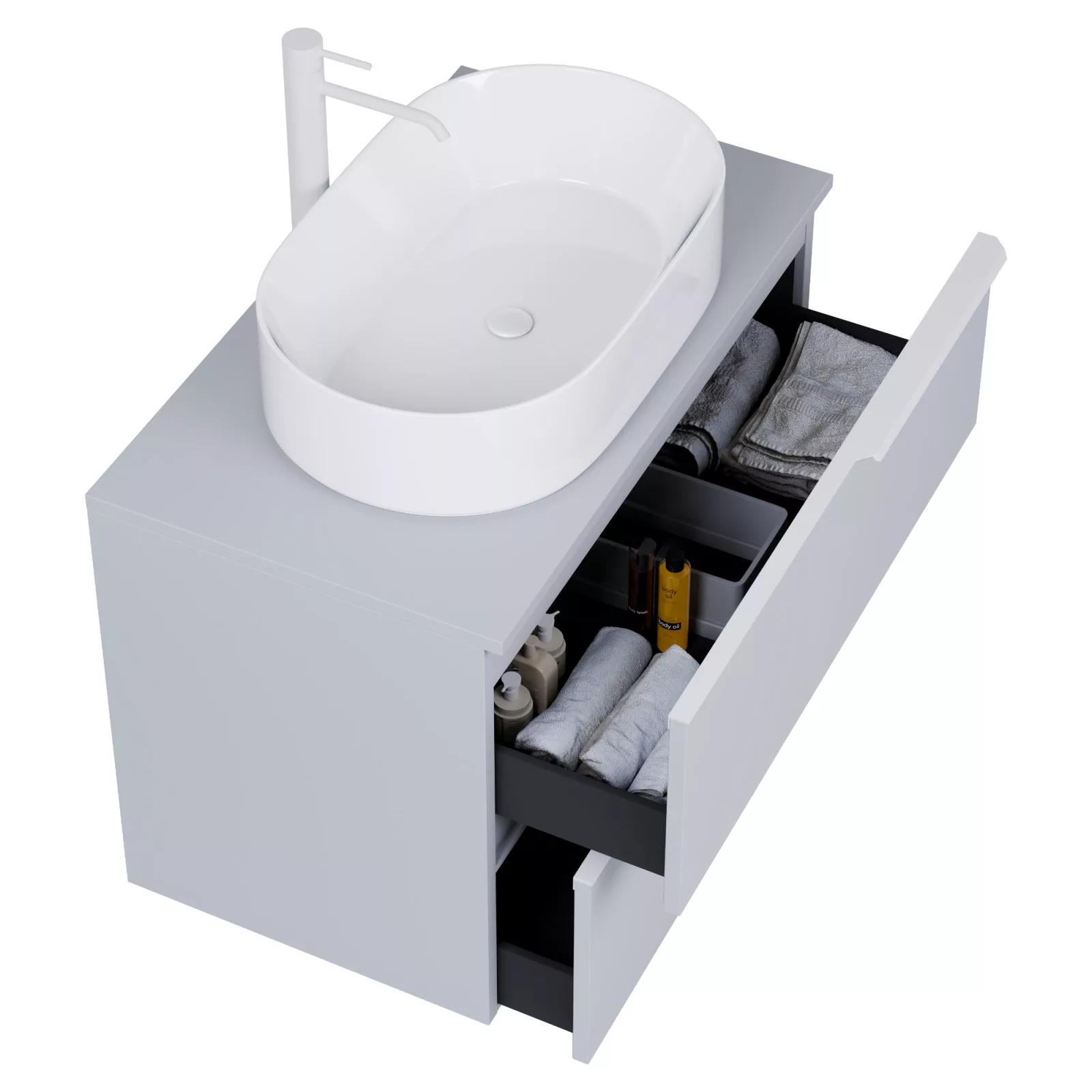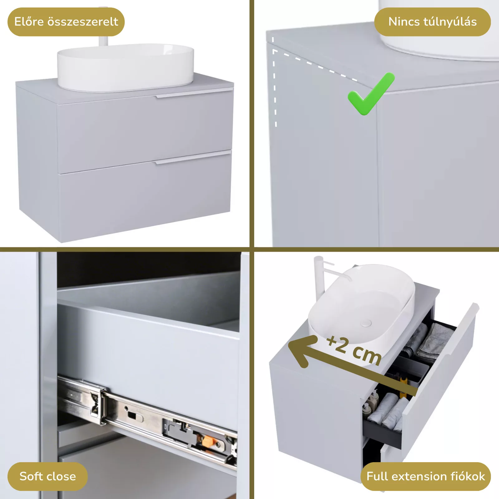 • füst szürke mosdószekrény, teljes kihúzhatóságú fiókokkal