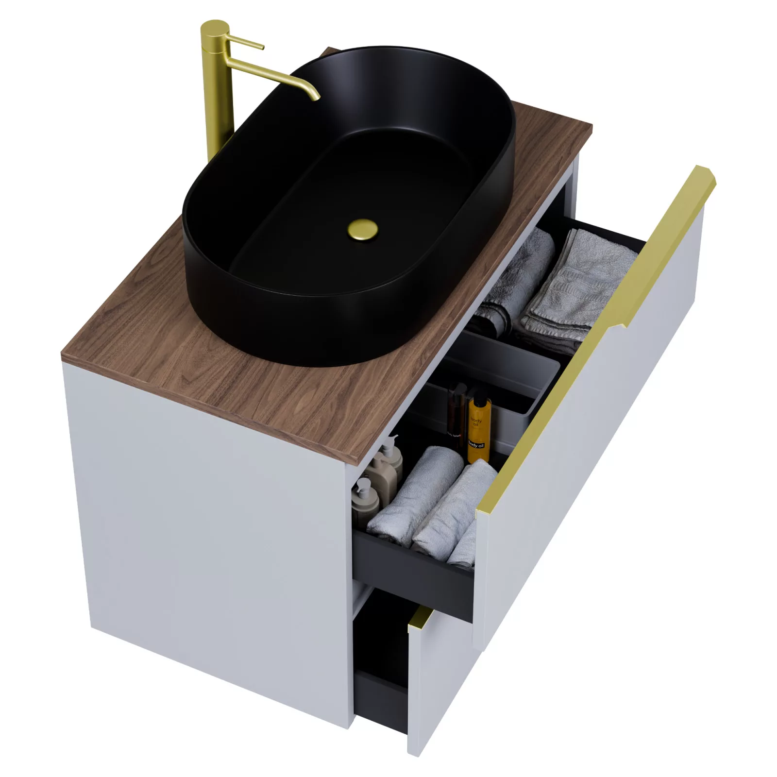Saját márkás 60 cm széles fali mosdószekrény füst szürke színben, szálcsiszolt arany fogantyúkkal, tölgyfa színű mosdópulttal, rejtett fióksínnel és önbehúzos technológiával ellátott.