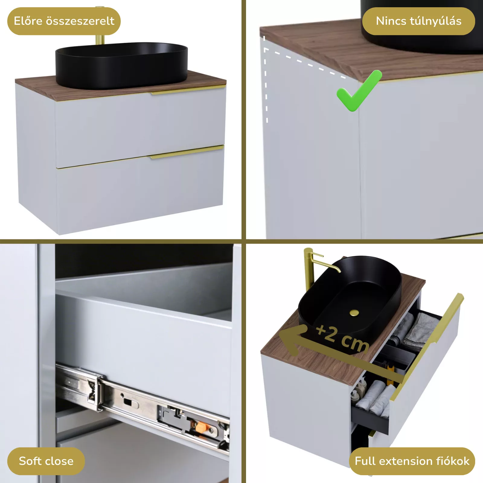 A bútort összeszerelve szállítjuk ki, így Önnek csak a mosdót és a fiók frontot kell ráhelyeznie!