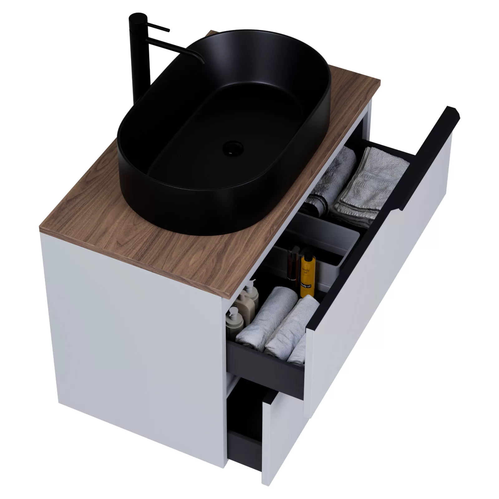 Napjainkban a praktikum mellett a fürdőszoba esztétikus megjelenése is fontos szempont. A függesztett bútorok egyre elterjedtebbé válnak, mivel számos előnnyel rendelkeznek, ide sorolható a modern, könnyed megjelenés és az egyszerű tisztítás. A függesztett fürdőszobai bútorok a klasszikus és modernebb stílusú fürdőszobákban is megállják a helyüket egyaránt. Nagyfokú rugalmasság jellemzi őket, mivel szinte bárhol elhelyezhetők a fürdőszobán belül. További előnyük, hogy soft close (csillapítós) zsanérral felszereltek, így  becsukáskor az ajtó vagy fiók finoman záródik be, csökkentve a terhelést és növelve az élettartamot. A szekrény fehér és matt fekete mosdóval, illetve mosdópulttal is szabadon kombinálható ízlés szerint. A teljesség érdekében a mosdószekrényekhez illő LED okostükröt és magas szekrényt is választhatunk, hogy a fürdőszobában lévő bútorok egy szemet gyönyörködtető egységet alkossanak.