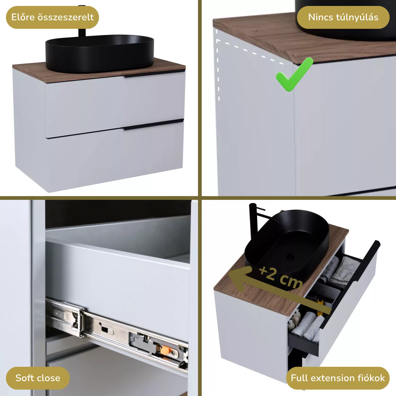A bútort összeszerelve szállítjuk ki, így Önnek csak a mosdót és a fiók frontot kell ráhelyeznie!