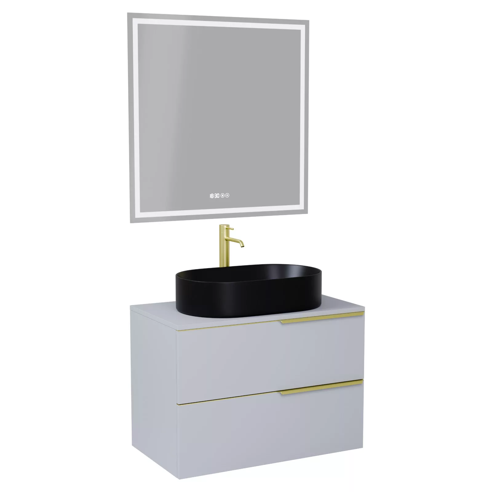 Saját márkás 60 cm széles komplett fürdőszoba bútor fali mosdószekrénnyel füst szürke színben, szálcsiszolt arany fogantyúkkal, füst szürke színű mosdópulttal és fali okos LED tükörrel.