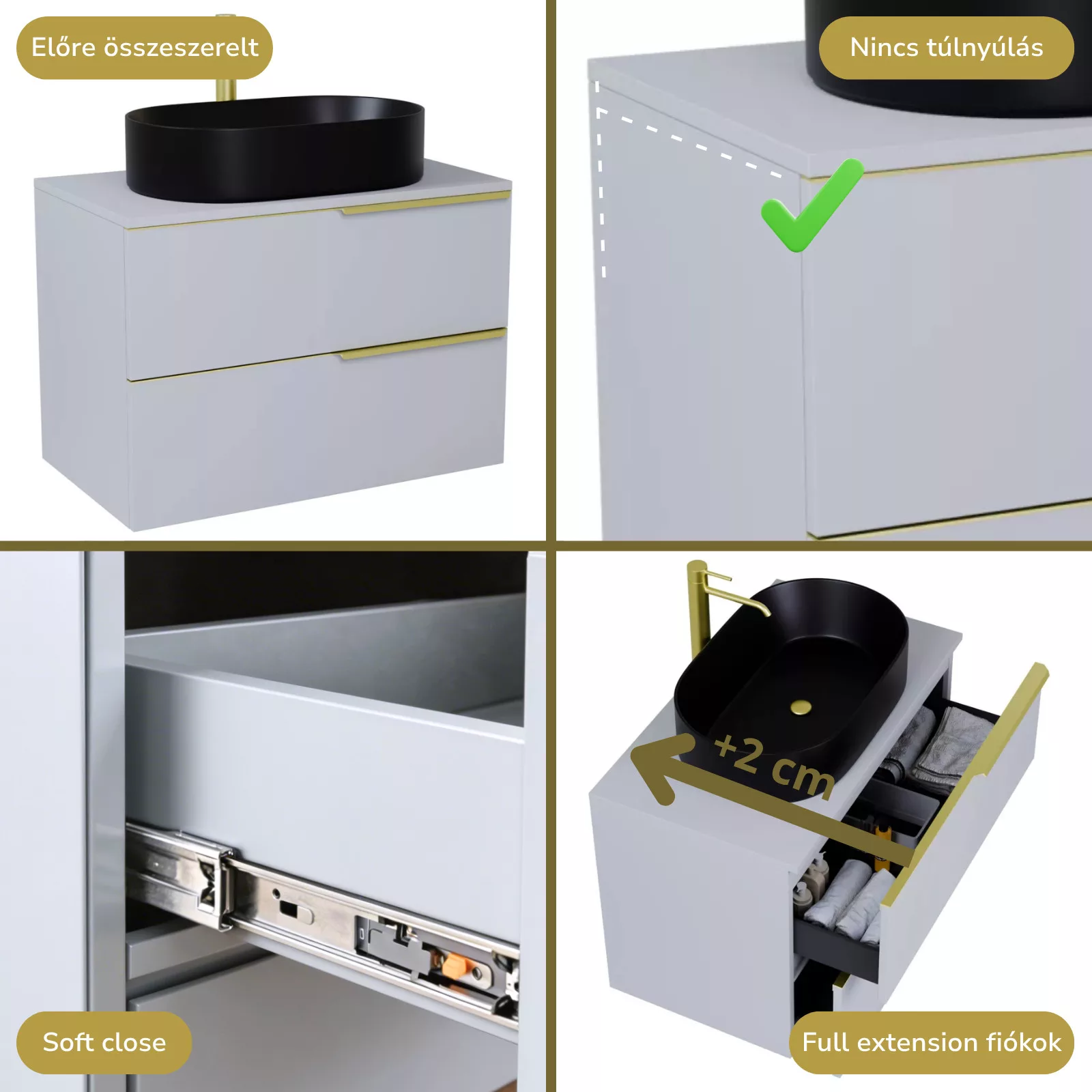 A bútort összeszerelve szállítjuk ki, így Önnek csak a mosdót és a fiók frontot kell ráhelyeznie!