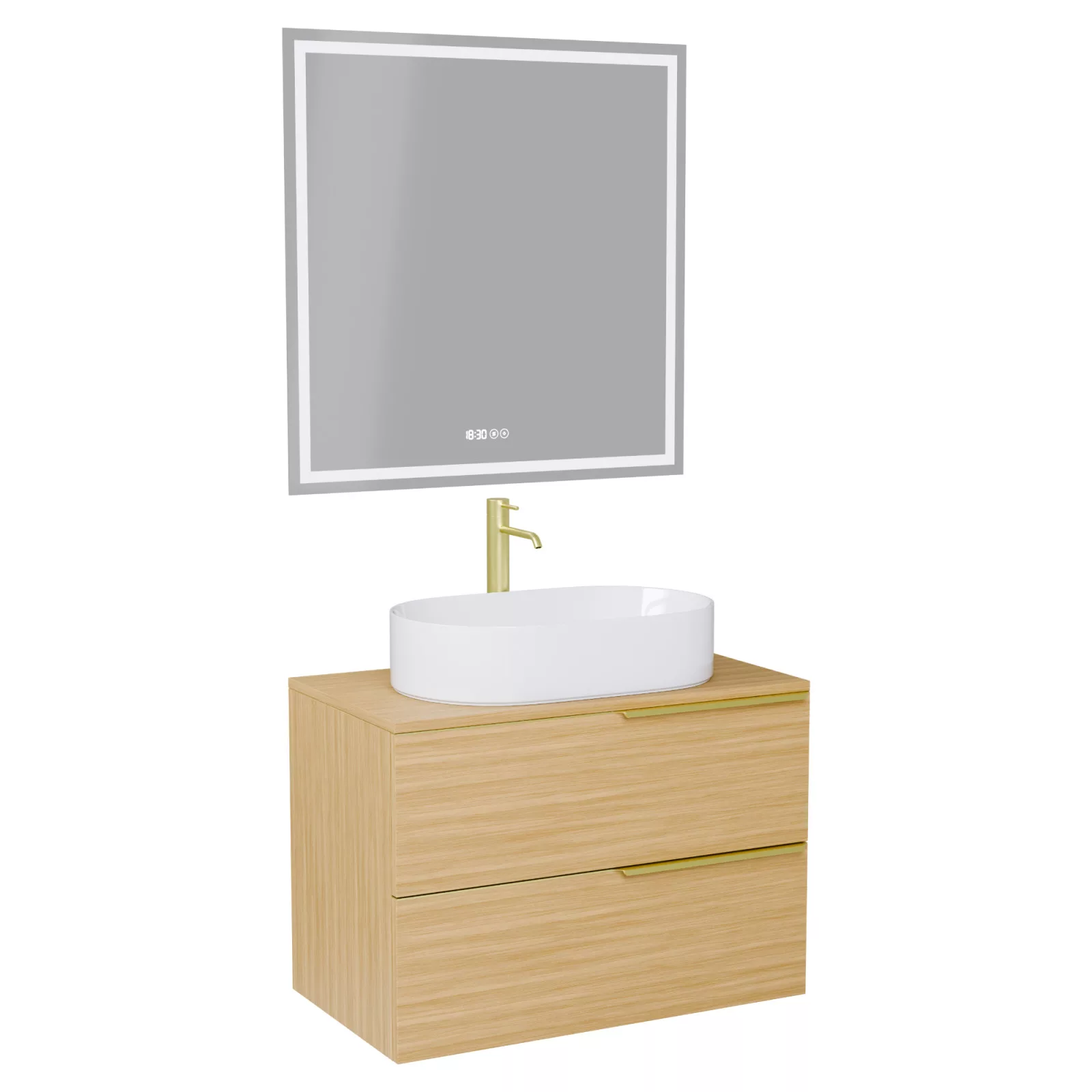 Saját márkás 60 cm széles komplett fürdőszoba bútor fali mosdószekrénnyel hikoridió színben, szálcsiszolt arany fogantyúkkal, hikoridió színű mosdópulttal és fali okos LED tükörrel.