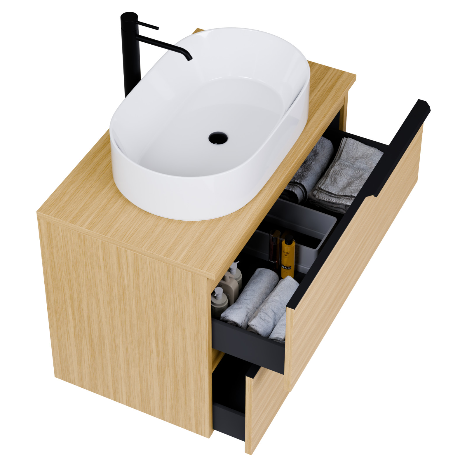 Saját márkás 80 cm széles fali mosdószekrény hikoridió színben, matt fekete fogantyúkkal, hikoridió színű mosdópulttal, rejtett fióksínnel és önbehúzos technológiával ellátott.