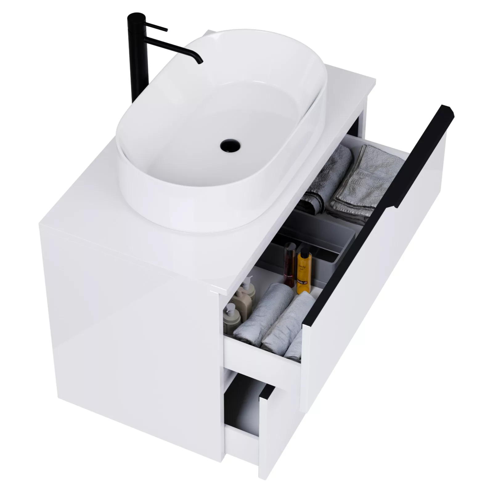 Saját márkás 60 cm széles fali mosdószekrény fényes fehér színben, matt fekete fogantyúkkal, fényes fehér színű mosdópulttal, rejtett fióksínnel és önbehúzos technológiával ellátott.