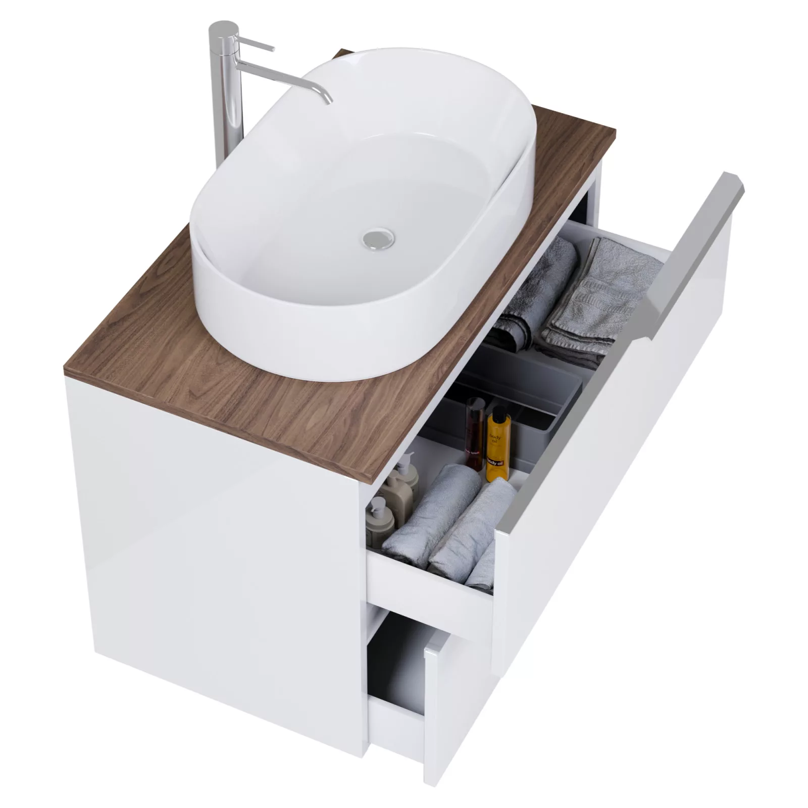 • fényes fehér mosdószekrény, teljes kihúzhatóságú fiókokkal