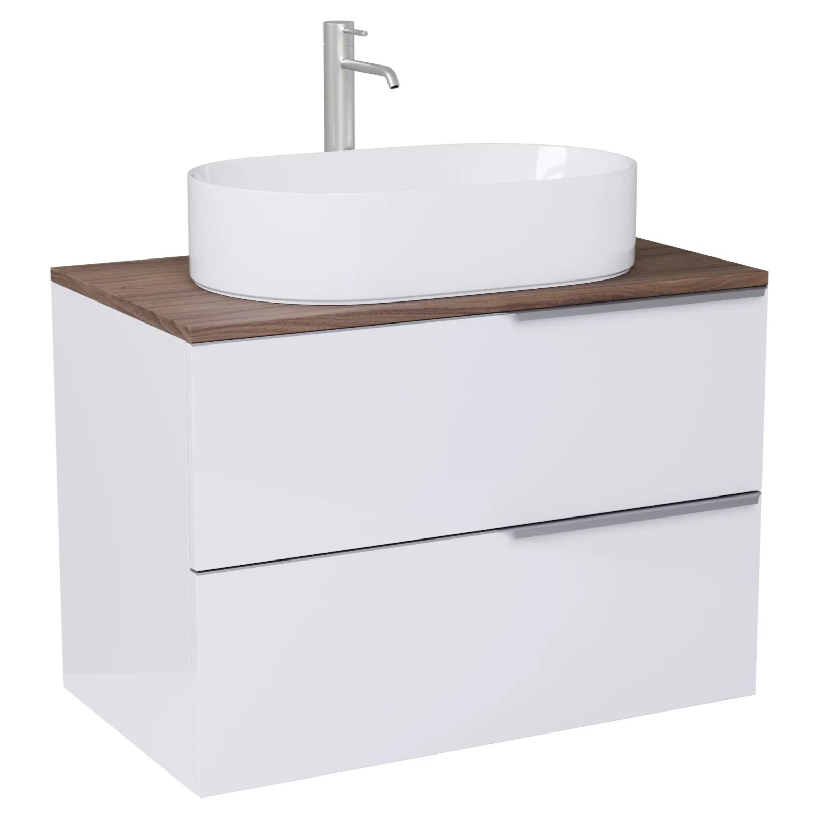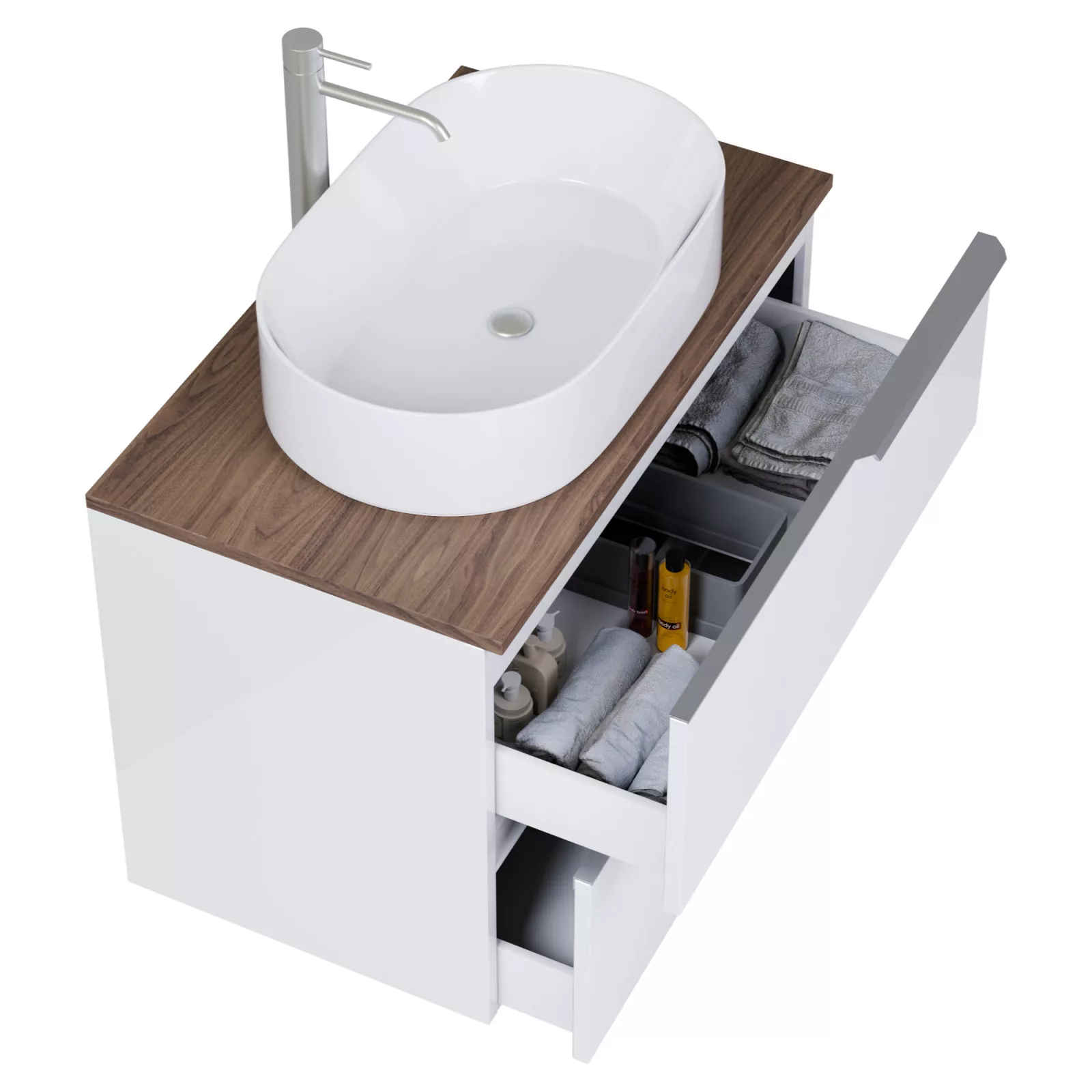 • fényes fehér mosdószekrény, teljes kihúzhatóságú fiókokkal