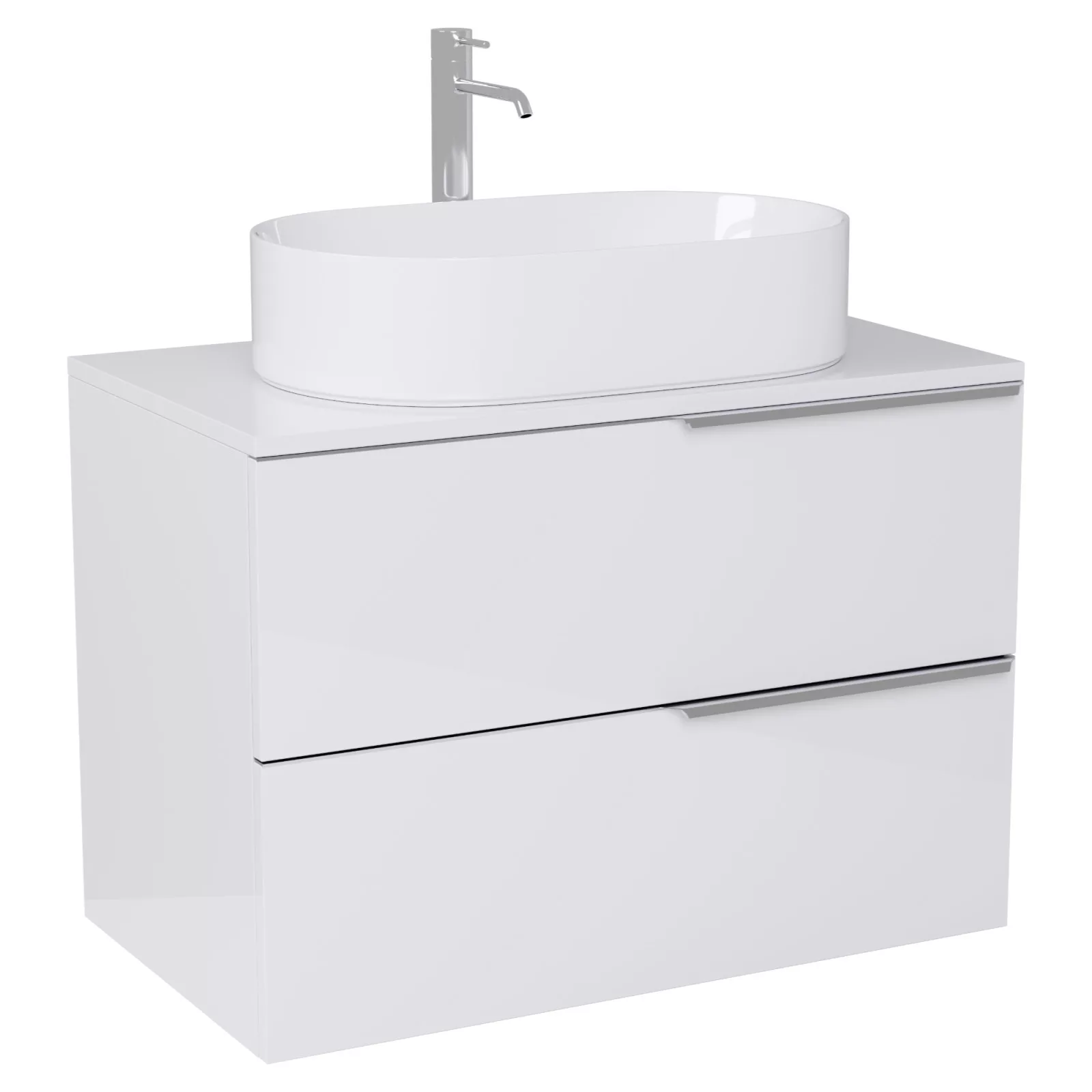 • fényes fehér mosdószekrény, teljes kihúzhatóságú fiókokkal